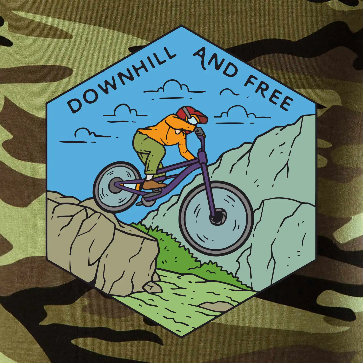 Tričko strednej gramáže vo farbách camouflage. Strih s bočnými švami. Lem priekrčníku z rebrového úpletu s prídavkom 5% elastanu. Vnútorná časť zadného priekrčníka začistená páskou vo farbe camouflage.