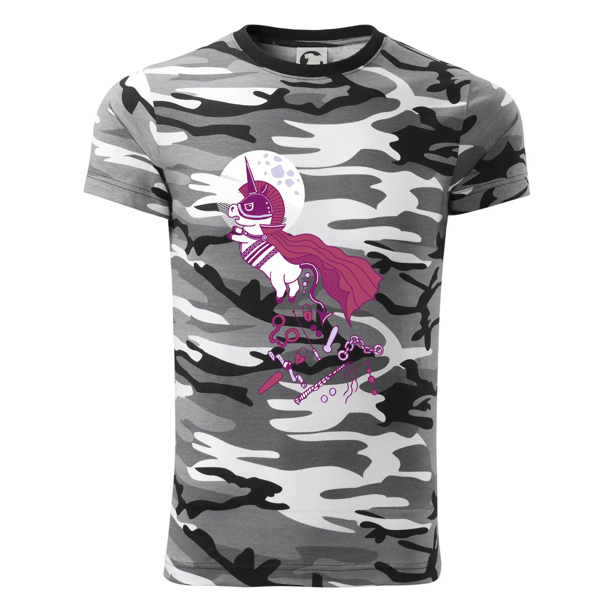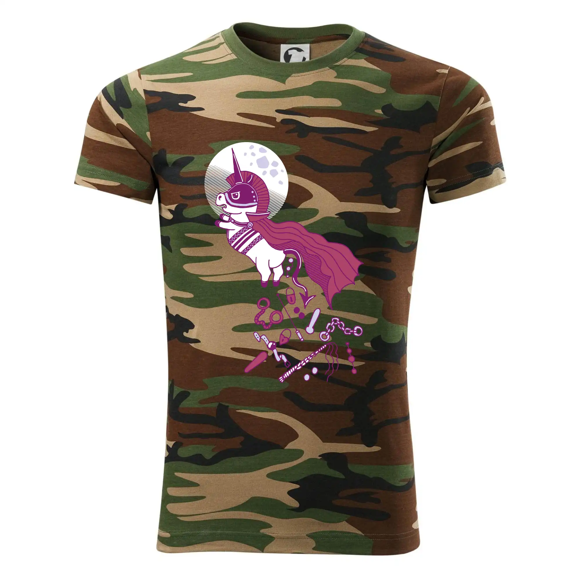 Tričko strednej gramáže vo farbách camouflage. Strih s bočnými švami. Lem priekrčníku z rebrového úpletu s prídavkom 5% elastanu. Vnútorná časť zadného priekrčníka začistená páskou vo farbe camouflage.