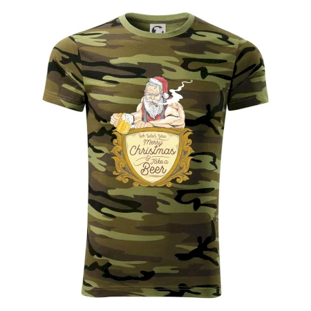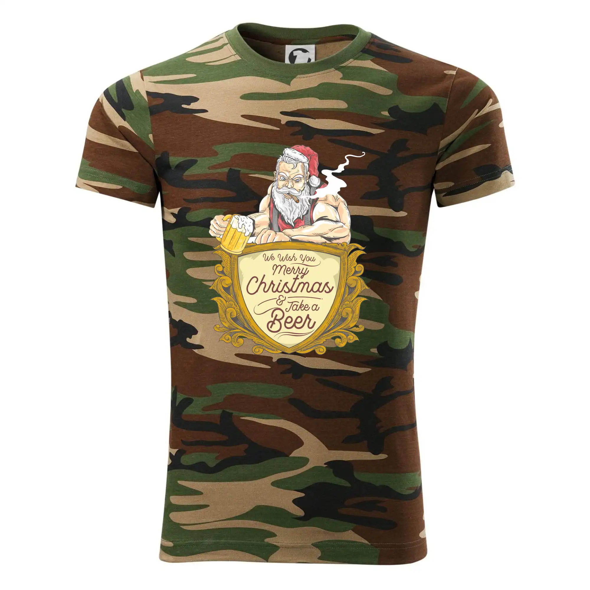 Tričko strednej gramáže vo farbách camouflage. Strih s bočnými švami. Lem priekrčníku z rebrového úpletu s prídavkom 5% elastanu. Vnútorná časť zadného priekrčníka začistená páskou vo farbe camouflage.