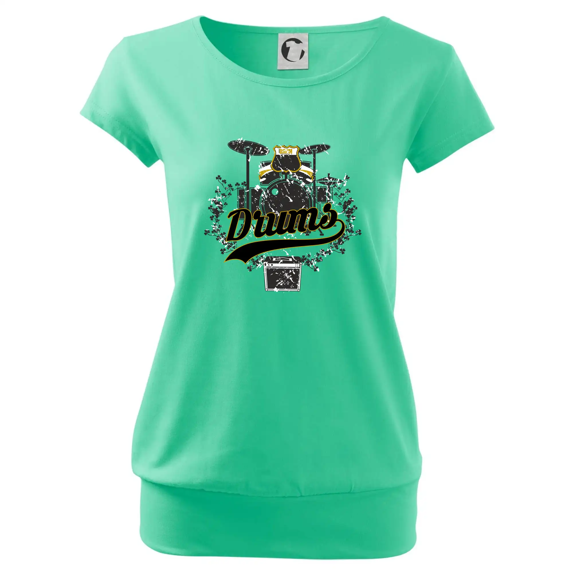 Trendové dámske tričko s veľmi krátkym rukávom, voľnejšieho strihu, v dolnom kraji všité do širokého lemu. Okrúhly priekrčník s úzkym lemom zo zhodného materiálu.