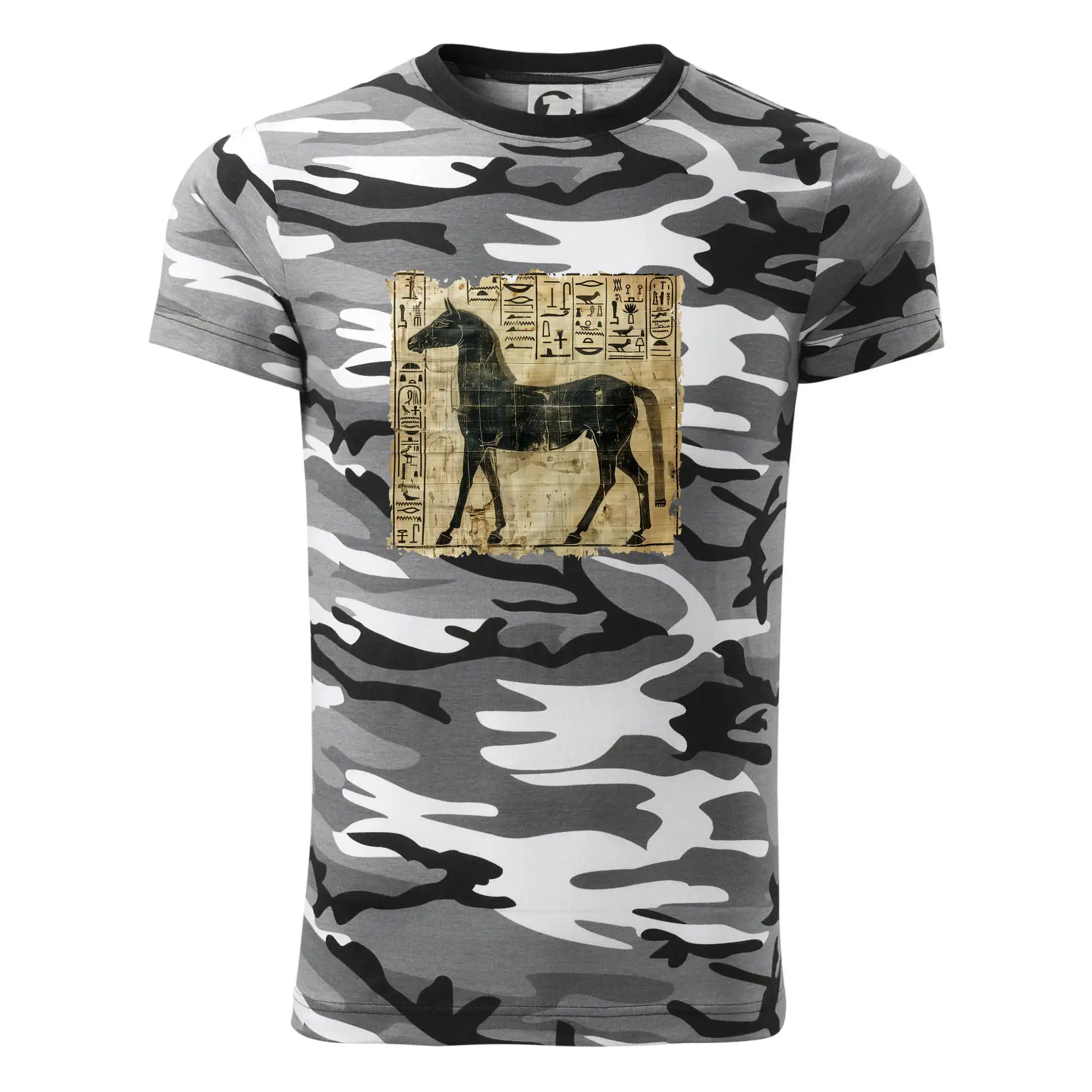 Tričko strednej gramáže vo farbách camouflage. Strih s bočnými švami. Lem priekrčníku z rebrového úpletu s prídavkom 5% elastanu. Vnútorná časť zadného priekrčníka začistená páskou vo farbe camouflage.