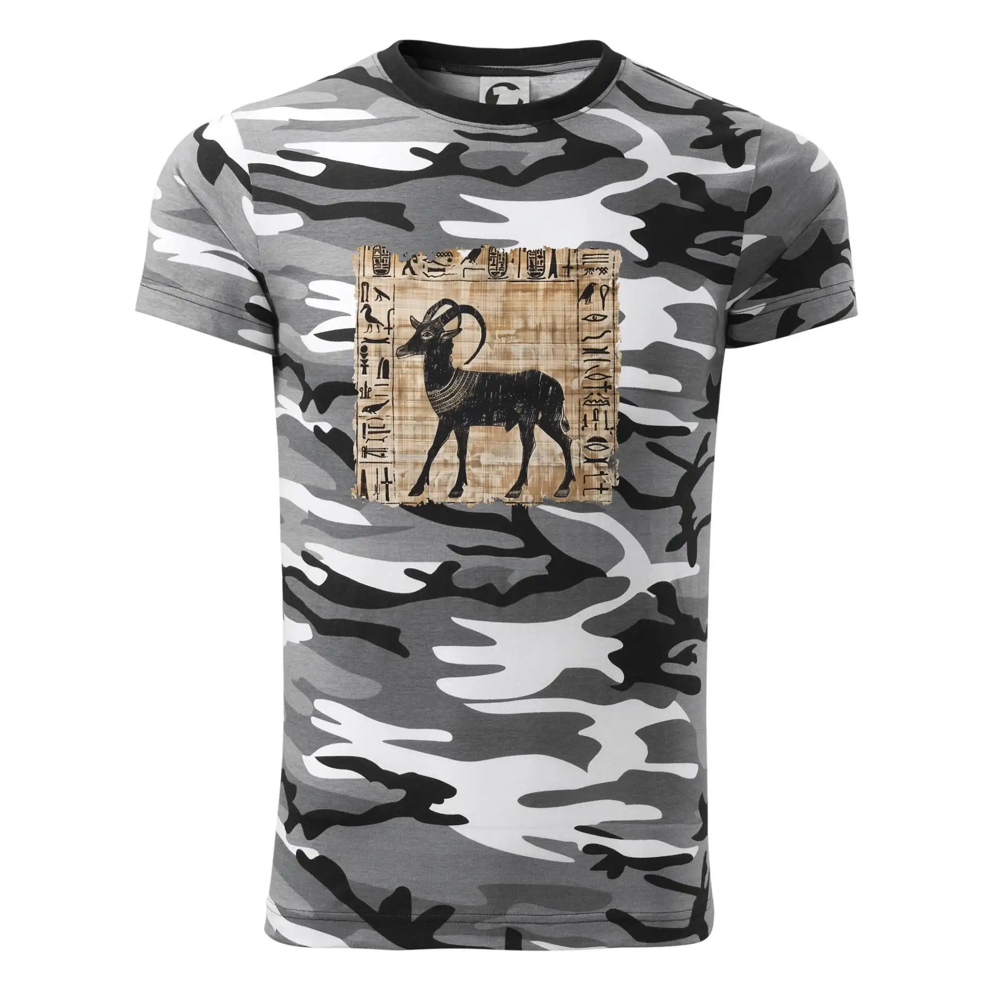 Tričko strednej gramáže vo farbách camouflage. Strih s bočnými švami. Lem priekrčníku z rebrového úpletu s prídavkom 5% elastanu. Vnútorná časť zadného priekrčníka začistená páskou vo farbe camouflage.