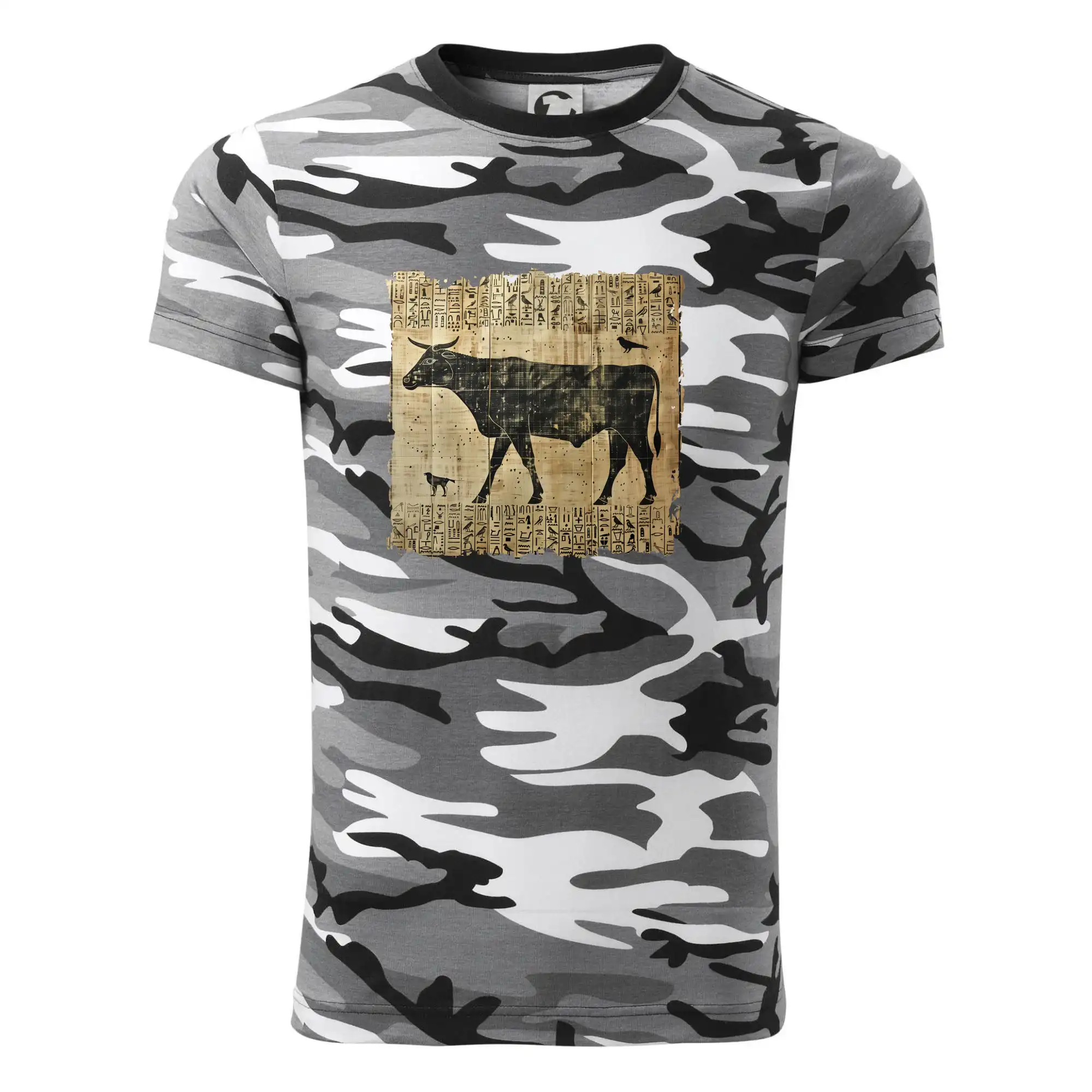 Tričko strednej gramáže vo farbách camouflage. Strih s bočnými švami. Lem priekrčníku z rebrového úpletu s prídavkom 5% elastanu. Vnútorná časť zadného priekrčníka začistená páskou vo farbe camouflage.