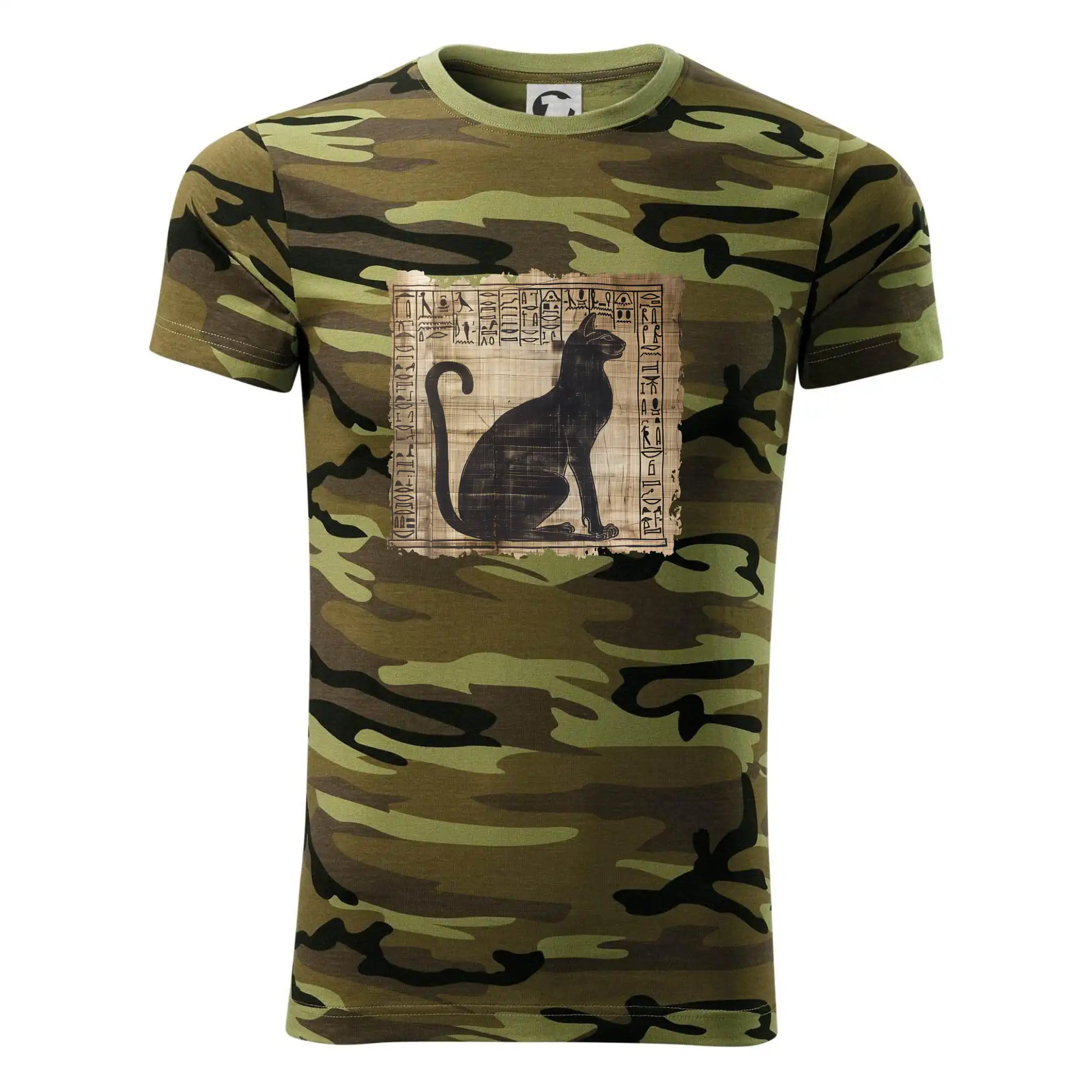 Tričko strednej gramáže vo farbách camouflage. Strih s bočnými švami. Lem priekrčníku z rebrového úpletu s prídavkom 5% elastanu. Vnútorná časť zadného priekrčníka začistená páskou vo farbe camouflage.