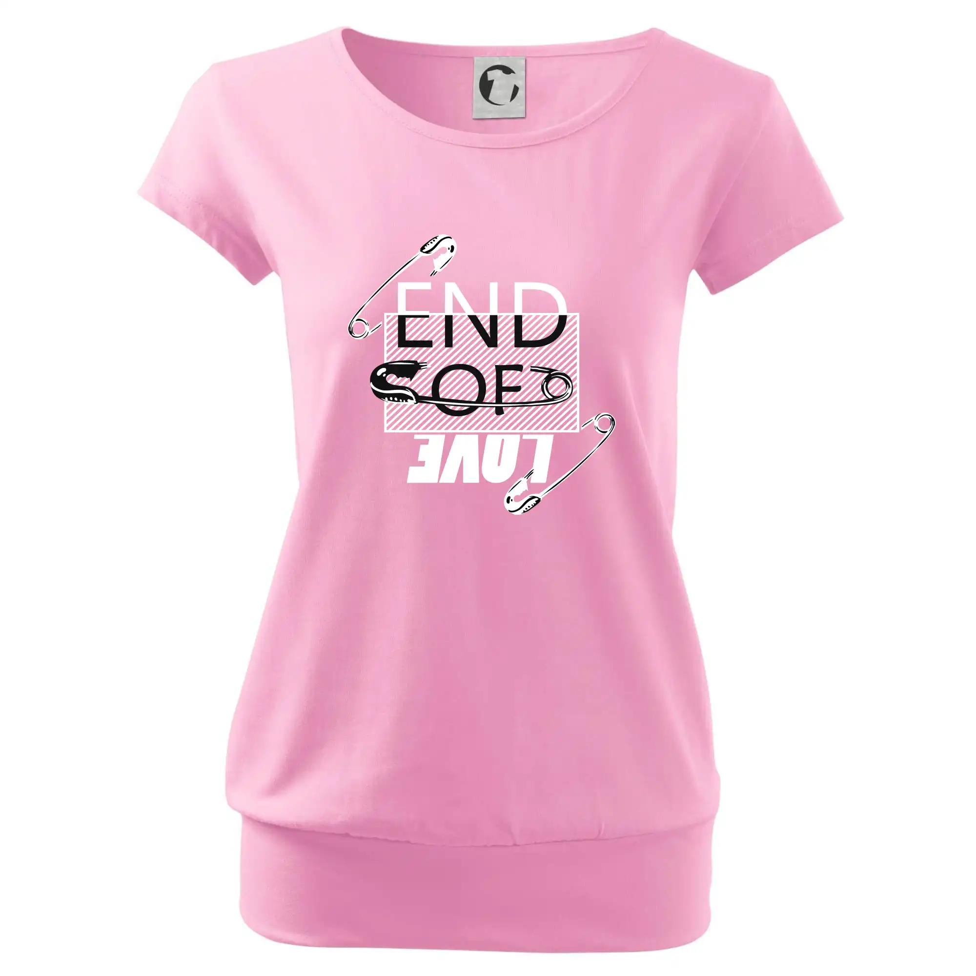 Trendové dámske tričko s veľmi krátkym rukávom, voľnejšieho strihu, v dolnom kraji všité do širokého lemu. Okrúhly priekrčník s úzkym lemom zo zhodného materiálu.