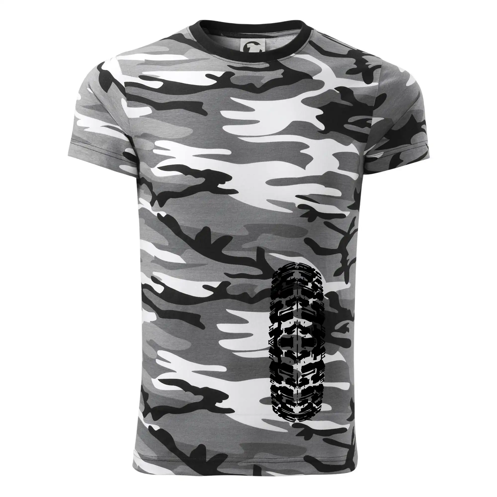 Tričko strednej gramáže vo farbách camouflage. Strih s bočnými švami. Lem priekrčníku z rebrového úpletu s prídavkom 5% elastanu. Vnútorná časť zadného priekrčníka začistená páskou vo farbe camouflage.
