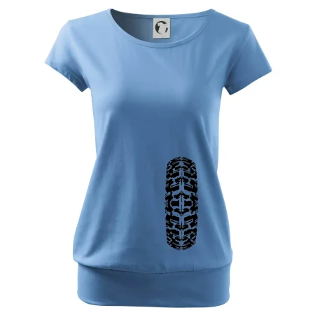 Trendové dámske tričko s veľmi krátkym rukávom, voľnejšieho strihu, v dolnom kraji všité do širokého lemu. Okrúhly priekrčník s úzkym lemom zo zhodného materiálu.