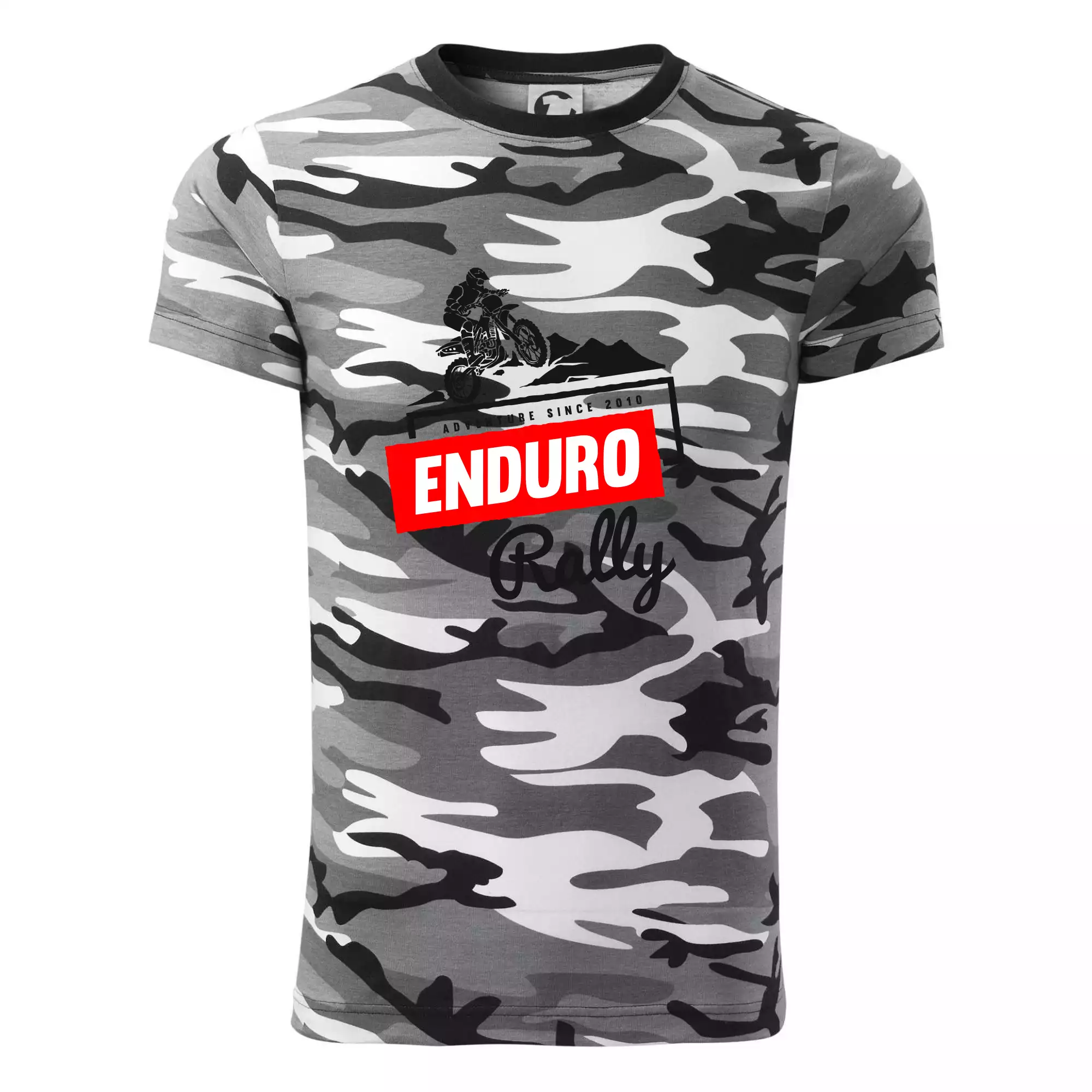 Tričko strednej gramáže vo farbách camouflage. Strih s bočnými švami. Lem priekrčníku z rebrového úpletu s prídavkom 5% elastanu. Vnútorná časť zadného priekrčníka začistená páskou vo farbe camouflage.