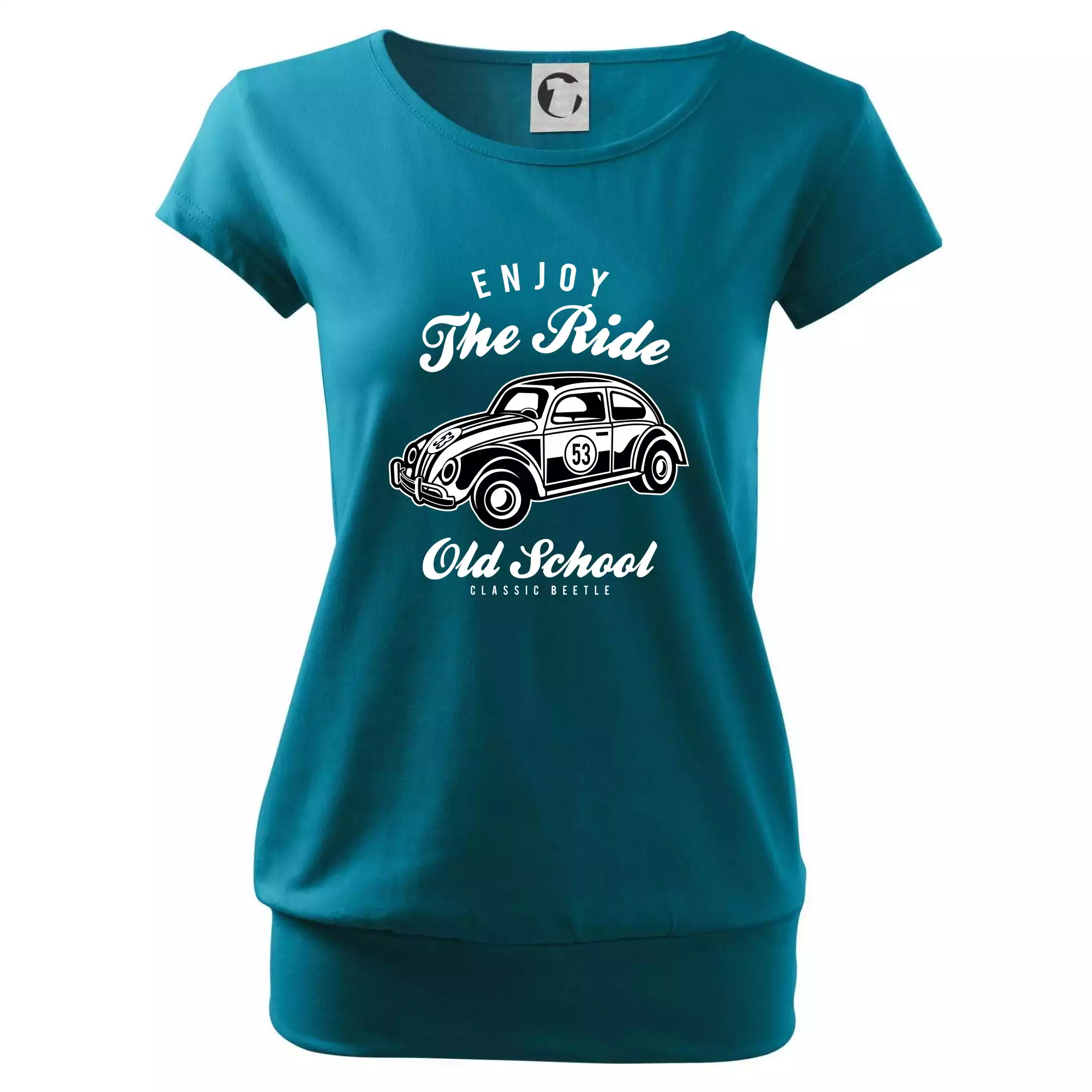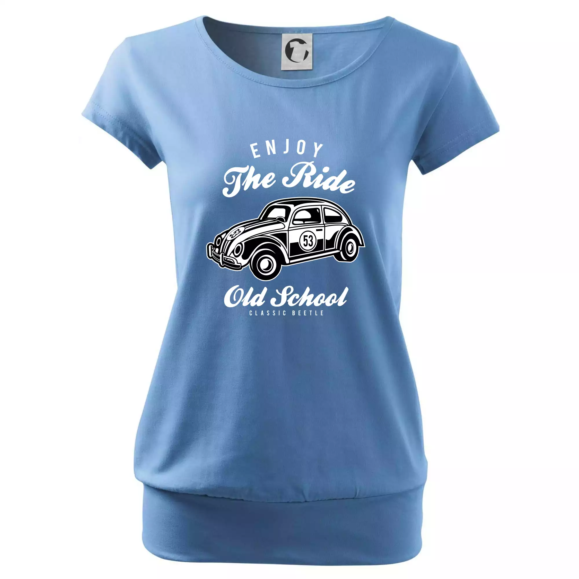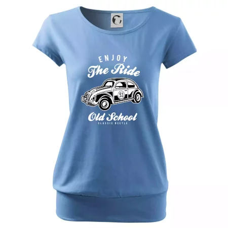 Trendové dámske tričko s veľmi krátkym rukávom, voľnejšieho strihu, v dolnom kraji všité do širokého lemu. Okrúhly priekrčník s úzkym lemom zo zhodného materiálu.