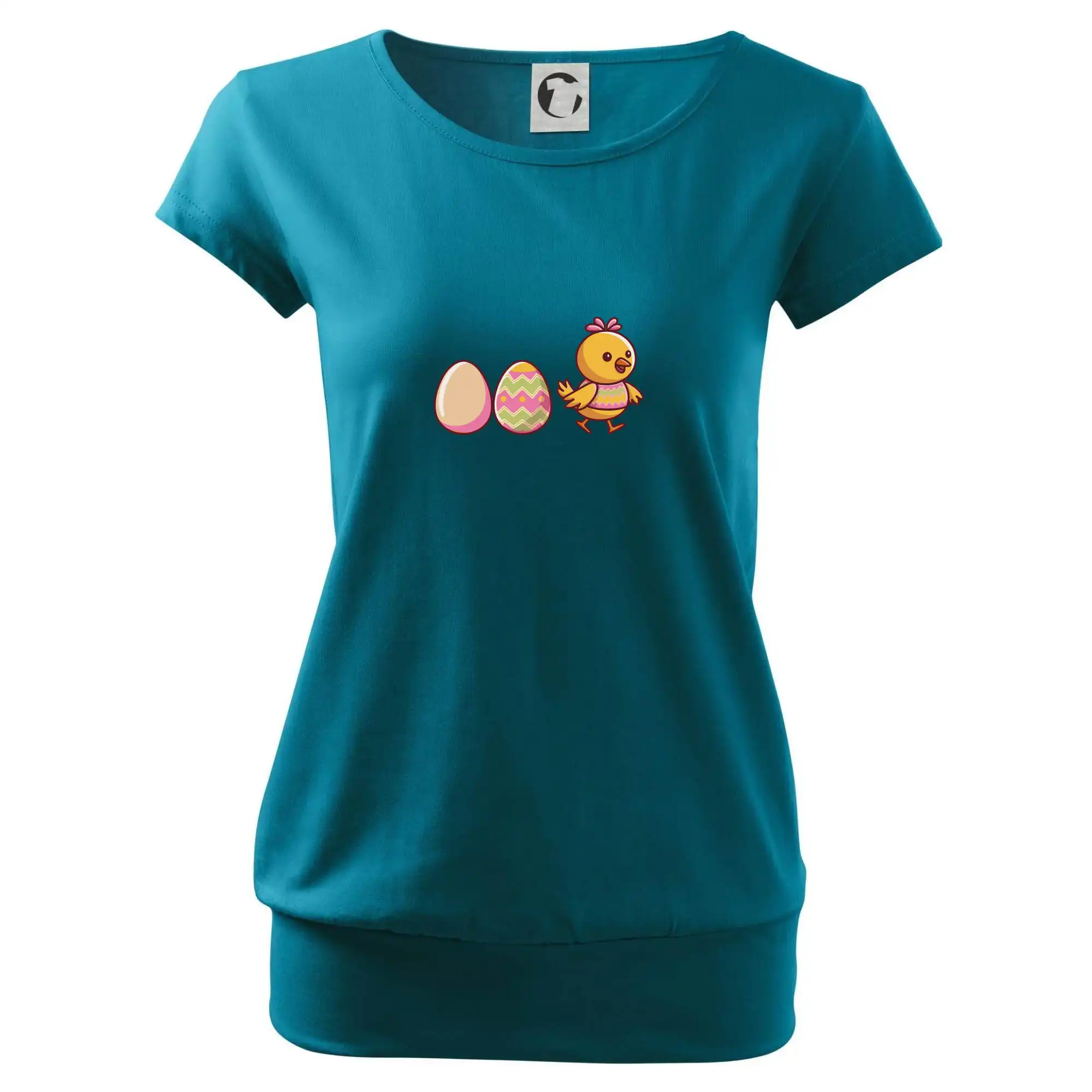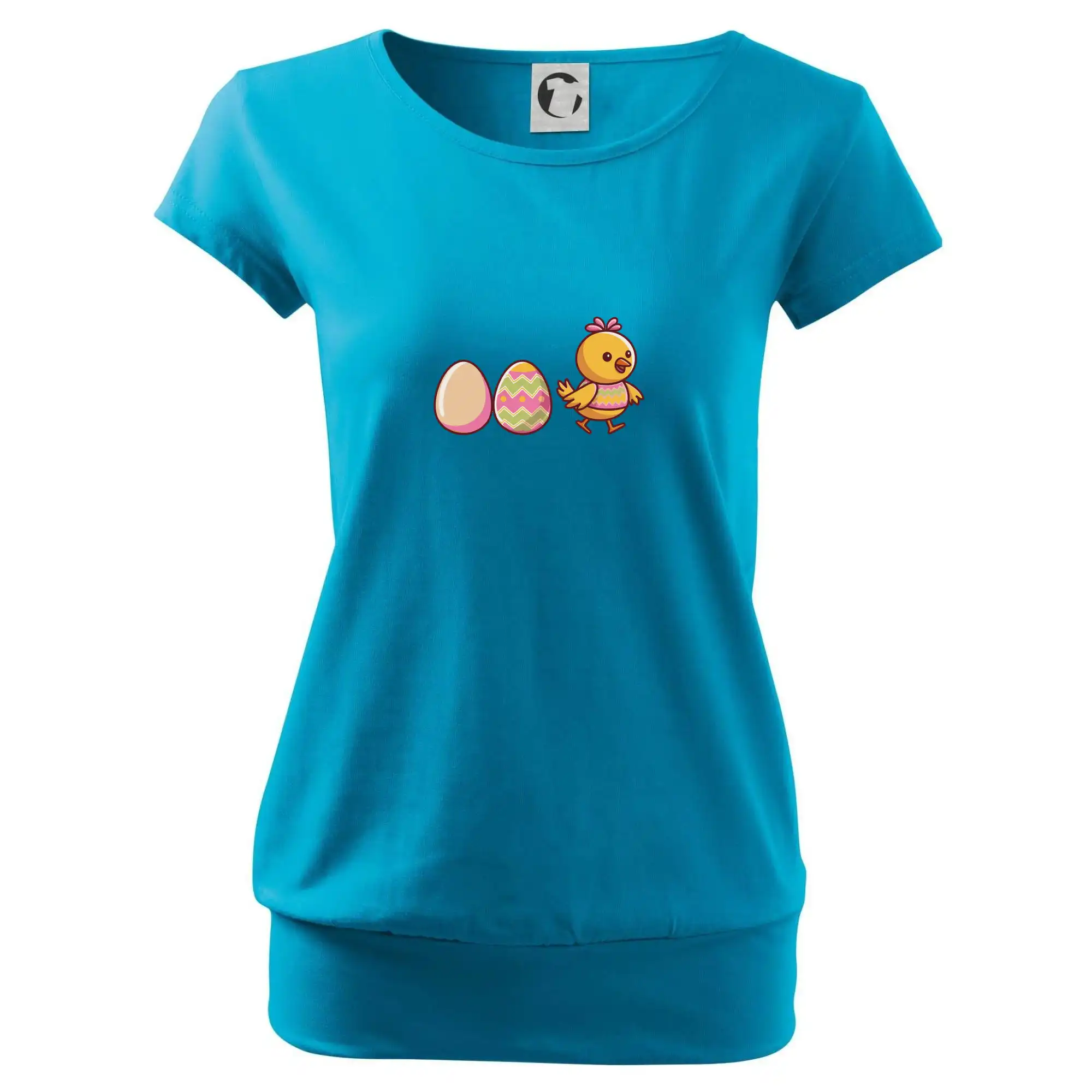 Trendové dámske tričko s veľmi krátkym rukávom, voľnejšieho strihu, v dolnom kraji všité do širokého lemu. Okrúhly priekrčník s úzkym lemom zo zhodného materiálu.