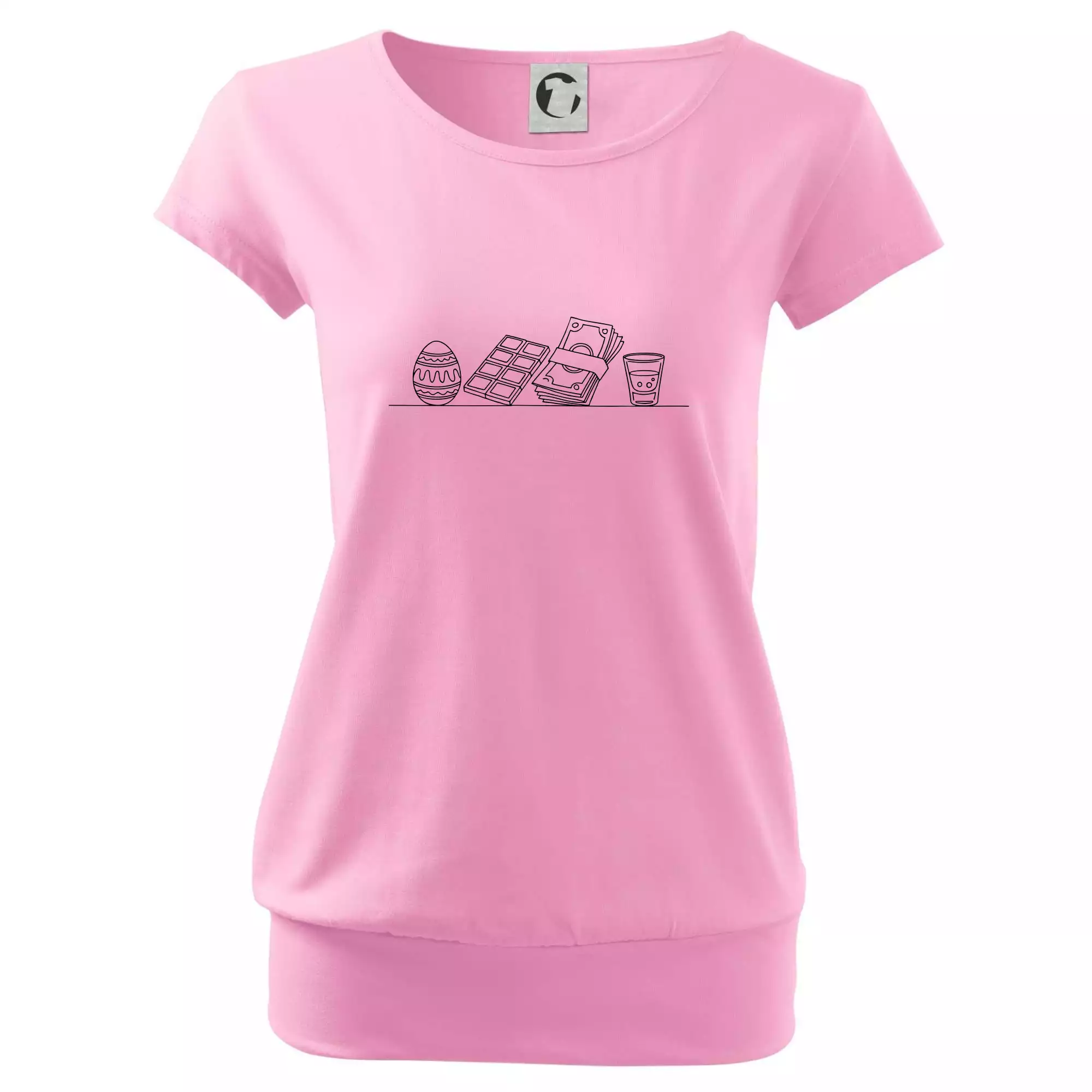 Trendové dámske tričko s veľmi krátkym rukávom, voľnejšieho strihu, v dolnom kraji všité do širokého lemu. Okrúhly priekrčník s úzkym lemom zo zhodného materiálu.