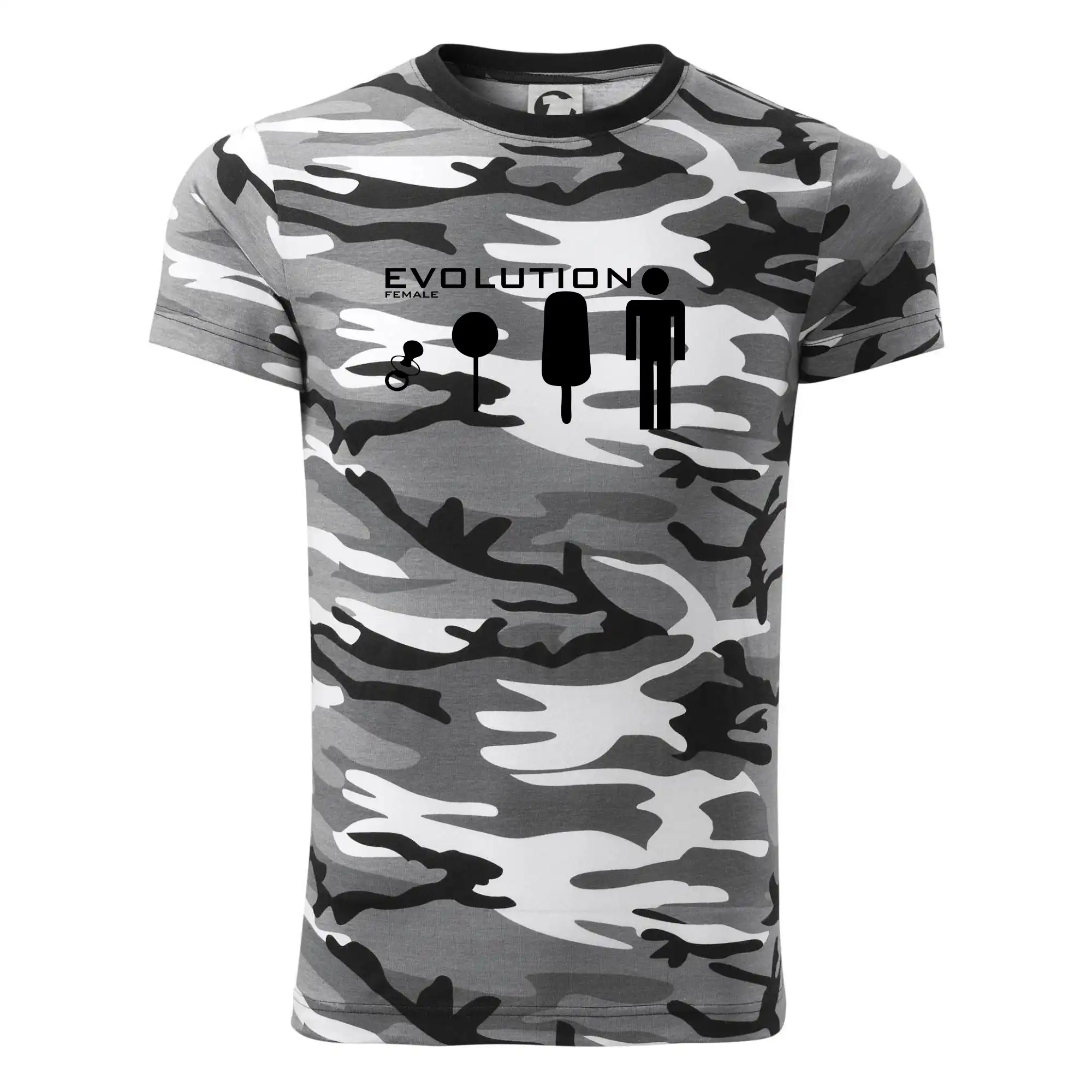 Tričko strednej gramáže vo farbách camouflage. Strih s bočnými švami. Lem priekrčníku z rebrového úpletu s prídavkom 5% elastanu. Vnútorná časť zadného priekrčníka začistená páskou vo farbe camouflage.