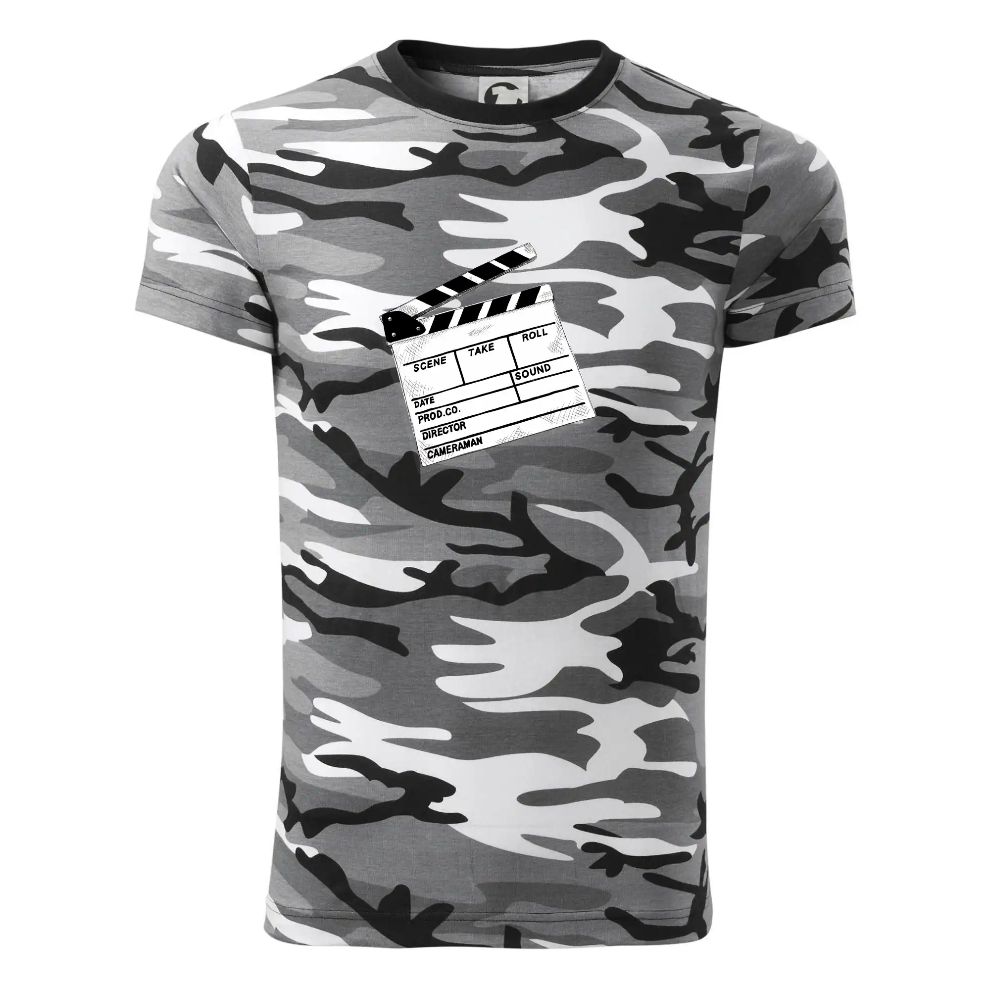 Tričko strednej gramáže vo farbách camouflage. Strih s bočnými švami. Lem priekrčníku z rebrového úpletu s prídavkom 5% elastanu. Vnútorná časť zadného priekrčníka začistená páskou vo farbe camouflage.