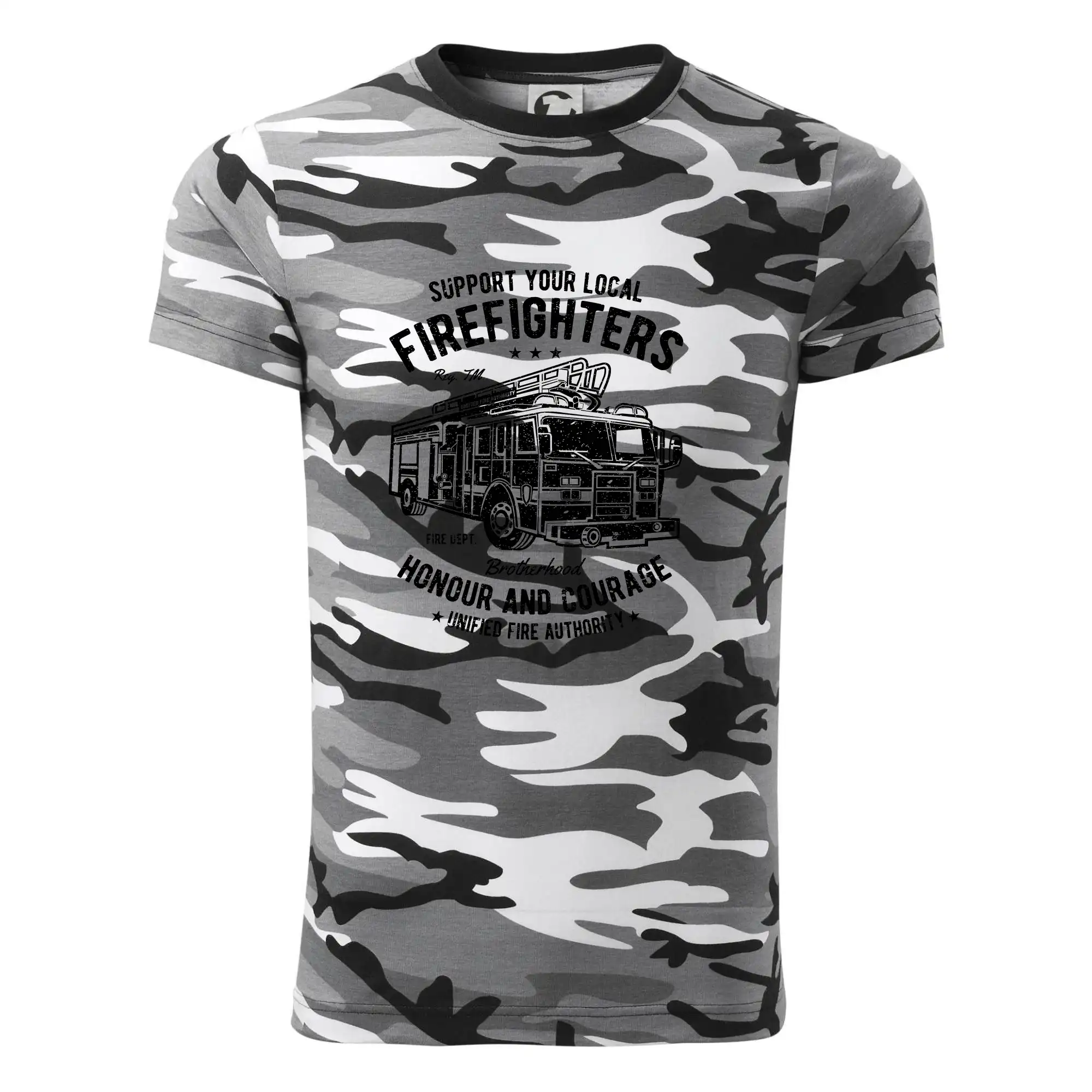 Tričko strednej gramáže vo farbách camouflage. Strih s bočnými švami. Lem priekrčníku z rebrového úpletu s prídavkom 5% elastanu. Vnútorná časť zadného priekrčníka začistená páskou vo farbe camouflage.