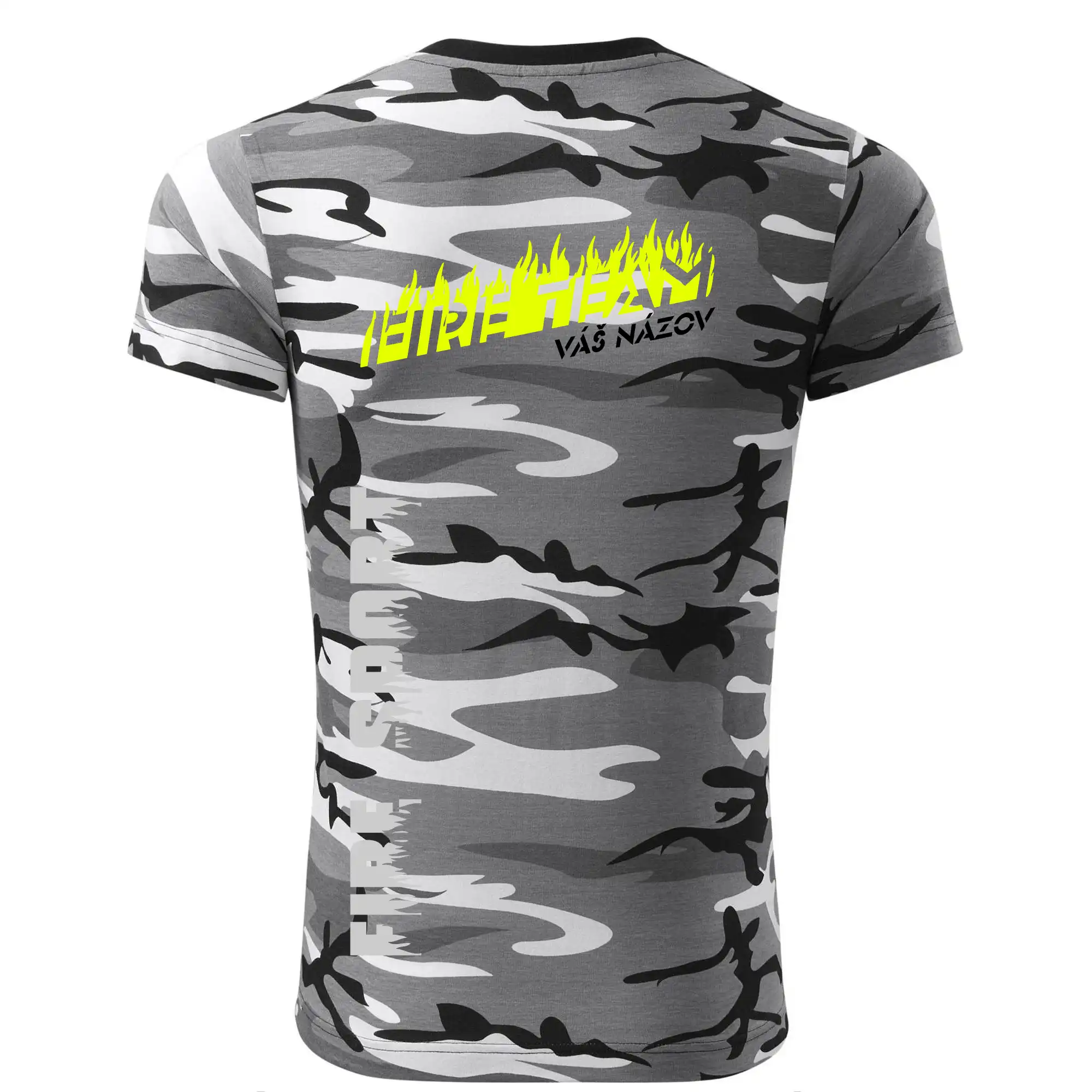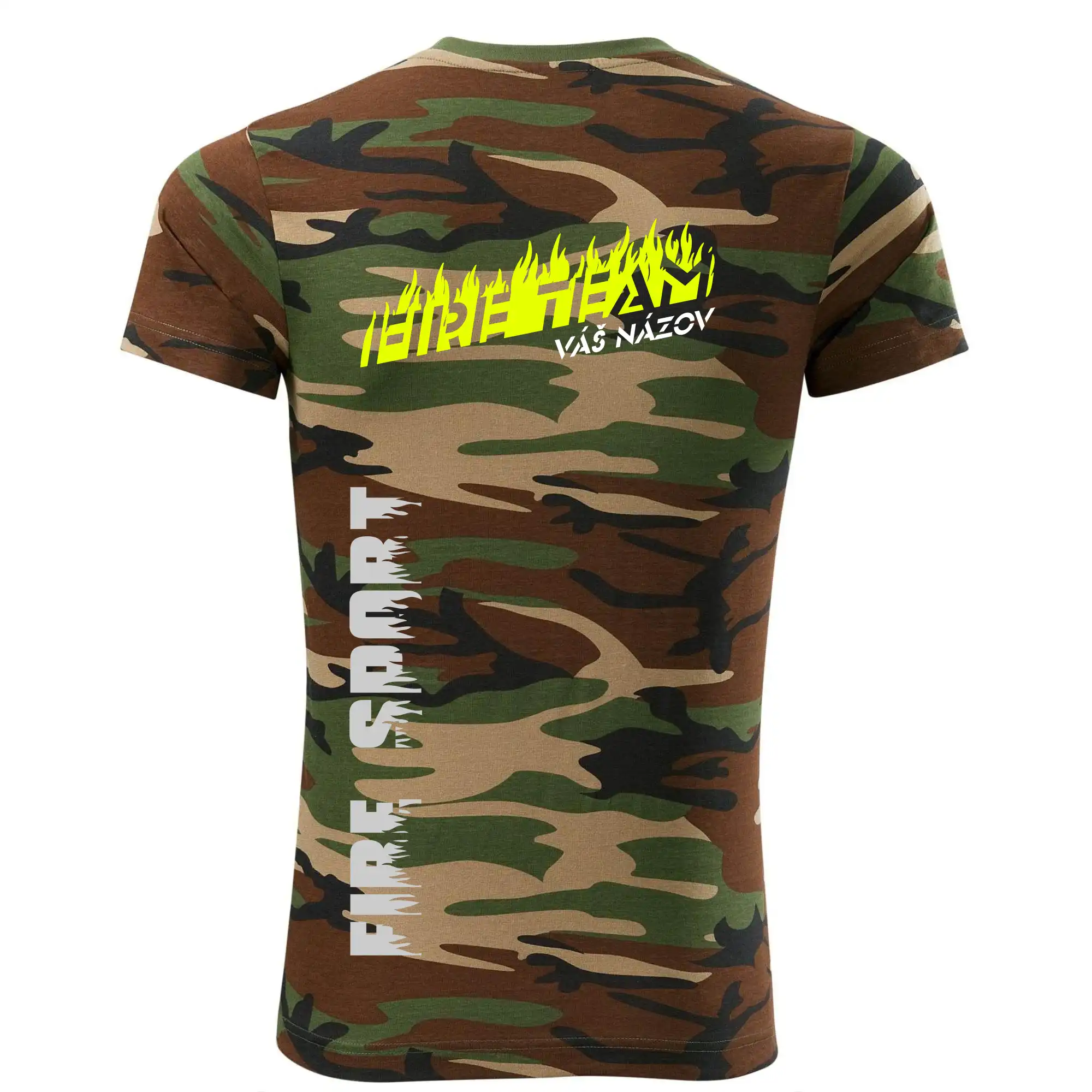 Tričko strednej gramáže vo farbách camouflage. Strih s bočnými švami. Lem priekrčníku z rebrového úpletu s prídavkom 5% elastanu. Vnútorná časť zadného priekrčníka začistená páskou vo farbe camouflage.