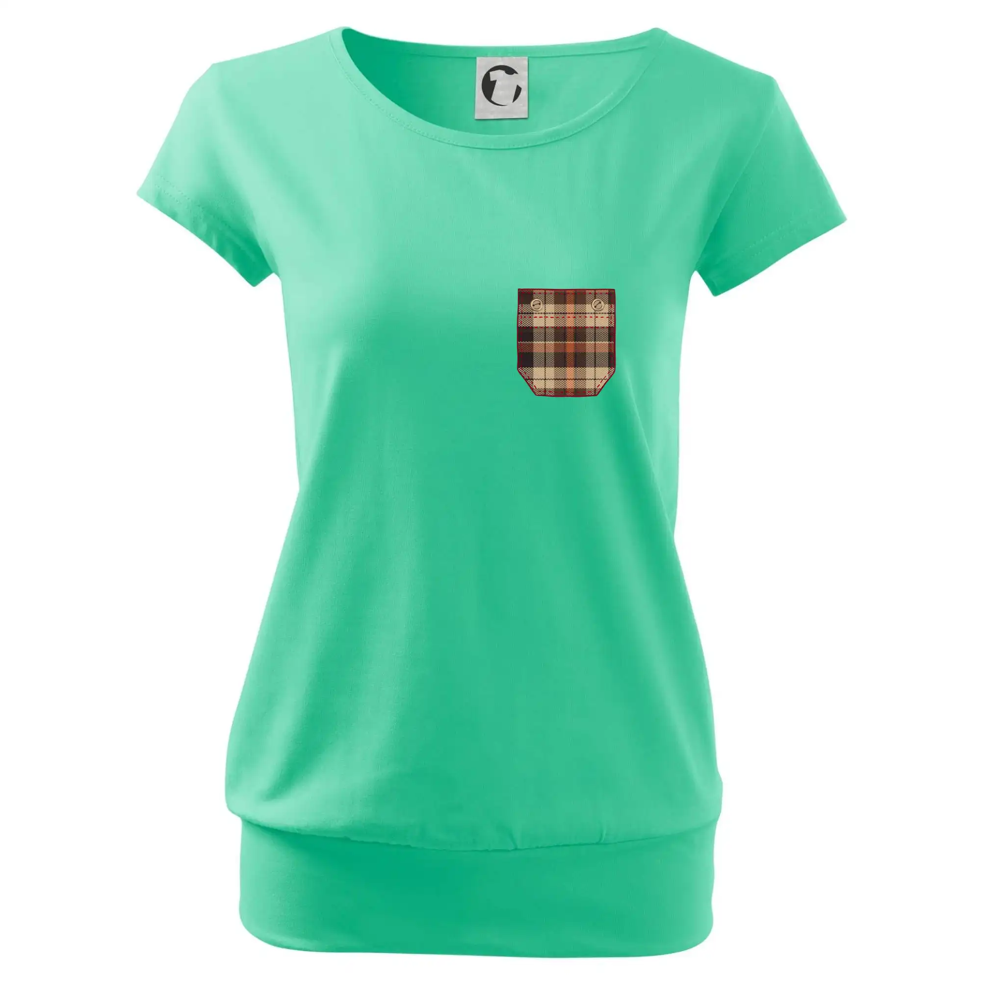 Trendové dámske tričko s veľmi krátkym rukávom, voľnejšieho strihu, v dolnom kraji všité do širokého lemu. Okrúhly priekrčník s úzkym lemom zo zhodného materiálu.
