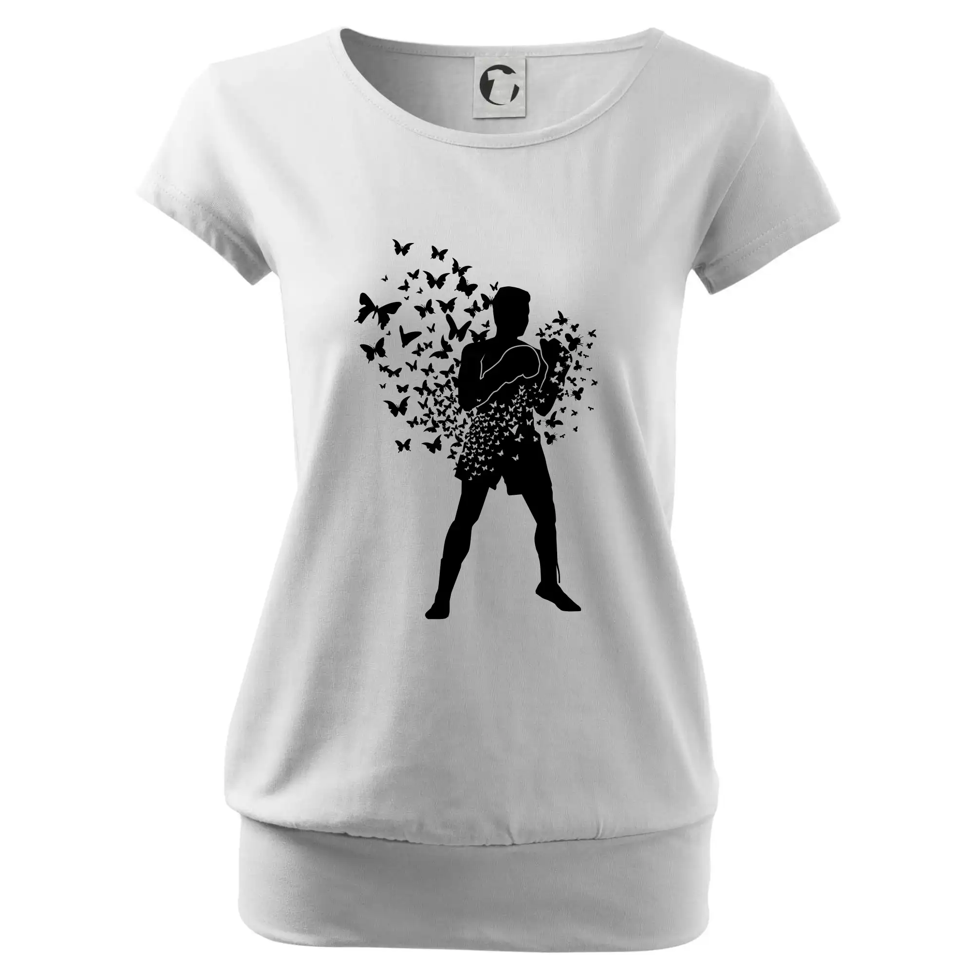 Trendové dámske tričko s veľmi krátkym rukávom, voľnejšieho strihu, v dolnom kraji všité do širokého lemu. Okrúhly priekrčník s úzkym lemom zo zhodného materiálu.