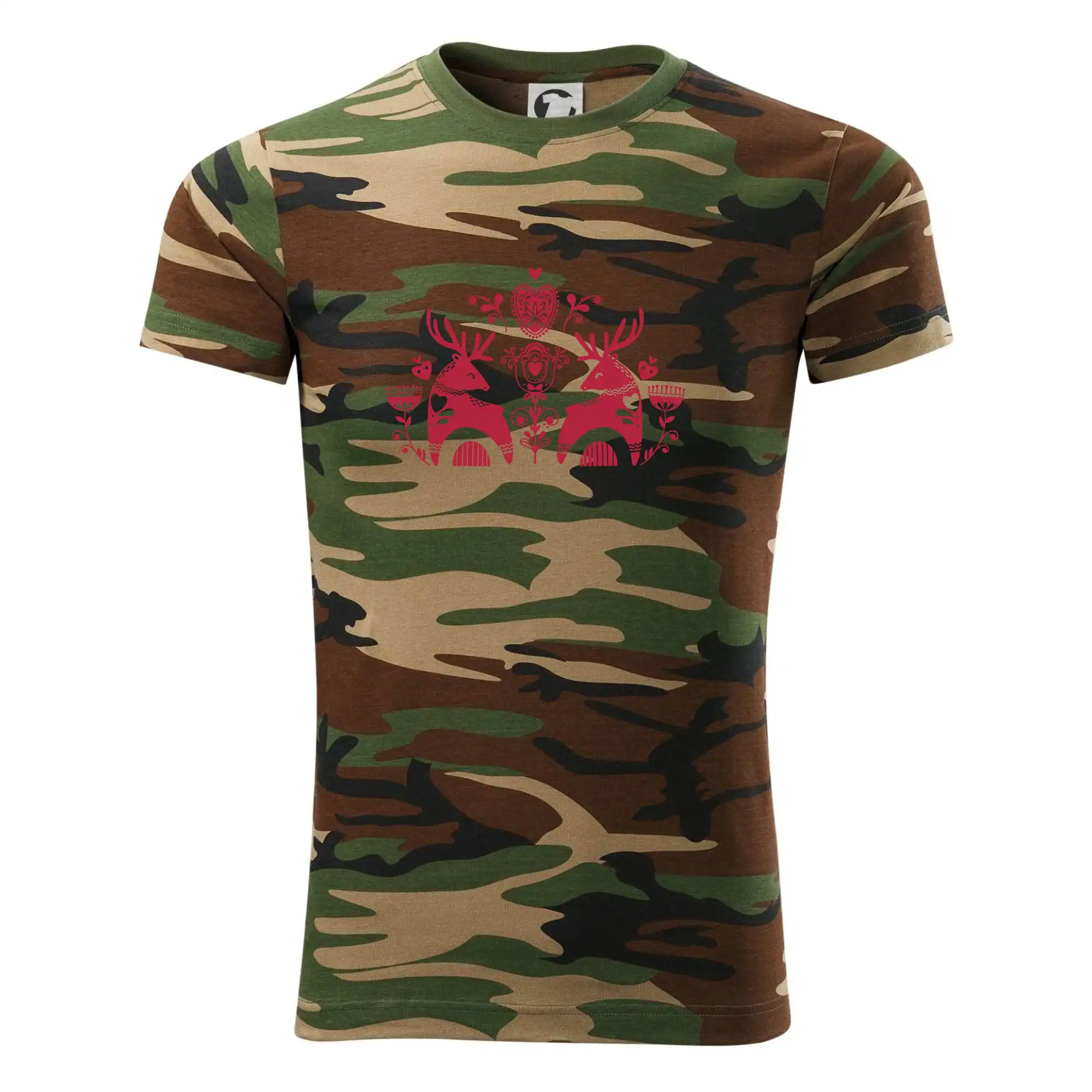 Tričko strednej gramáže vo farbách camouflage. Strih s bočnými švami. Lem priekrčníku z rebrového úpletu s prídavkom 5% elastanu. Vnútorná časť zadného priekrčníka začistená páskou vo farbe camouflage.