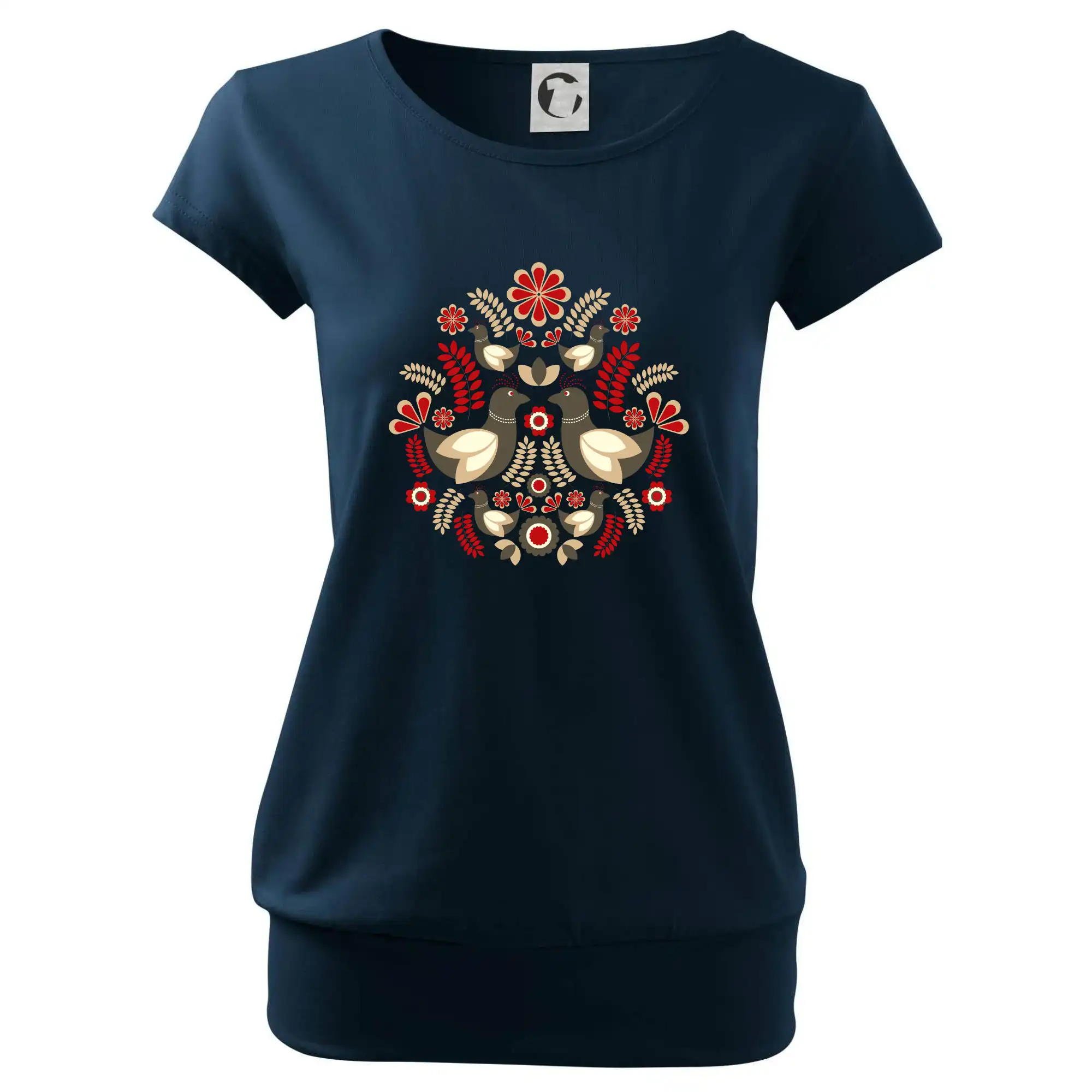 Trendové dámske tričko s veľmi krátkym rukávom, voľnejšieho strihu, v dolnom kraji všité do širokého lemu. Okrúhly priekrčník s úzkym lemom zo zhodného materiálu.