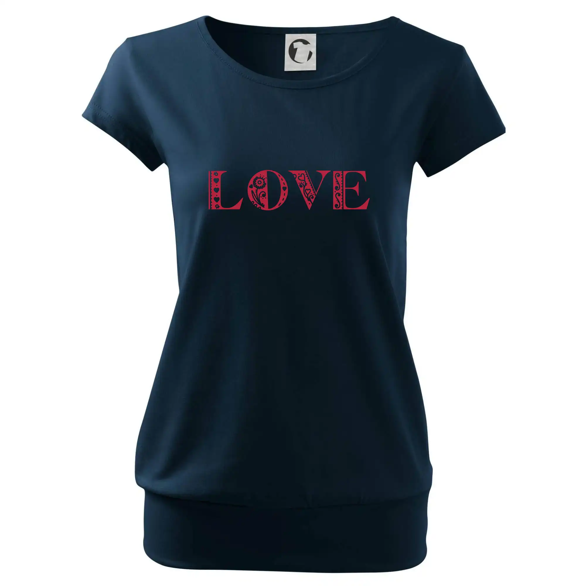 Trendové dámske tričko s veľmi krátkym rukávom, voľnejšieho strihu, v dolnom kraji všité do širokého lemu. Okrúhly priekrčník s úzkym lemom zo zhodného materiálu.