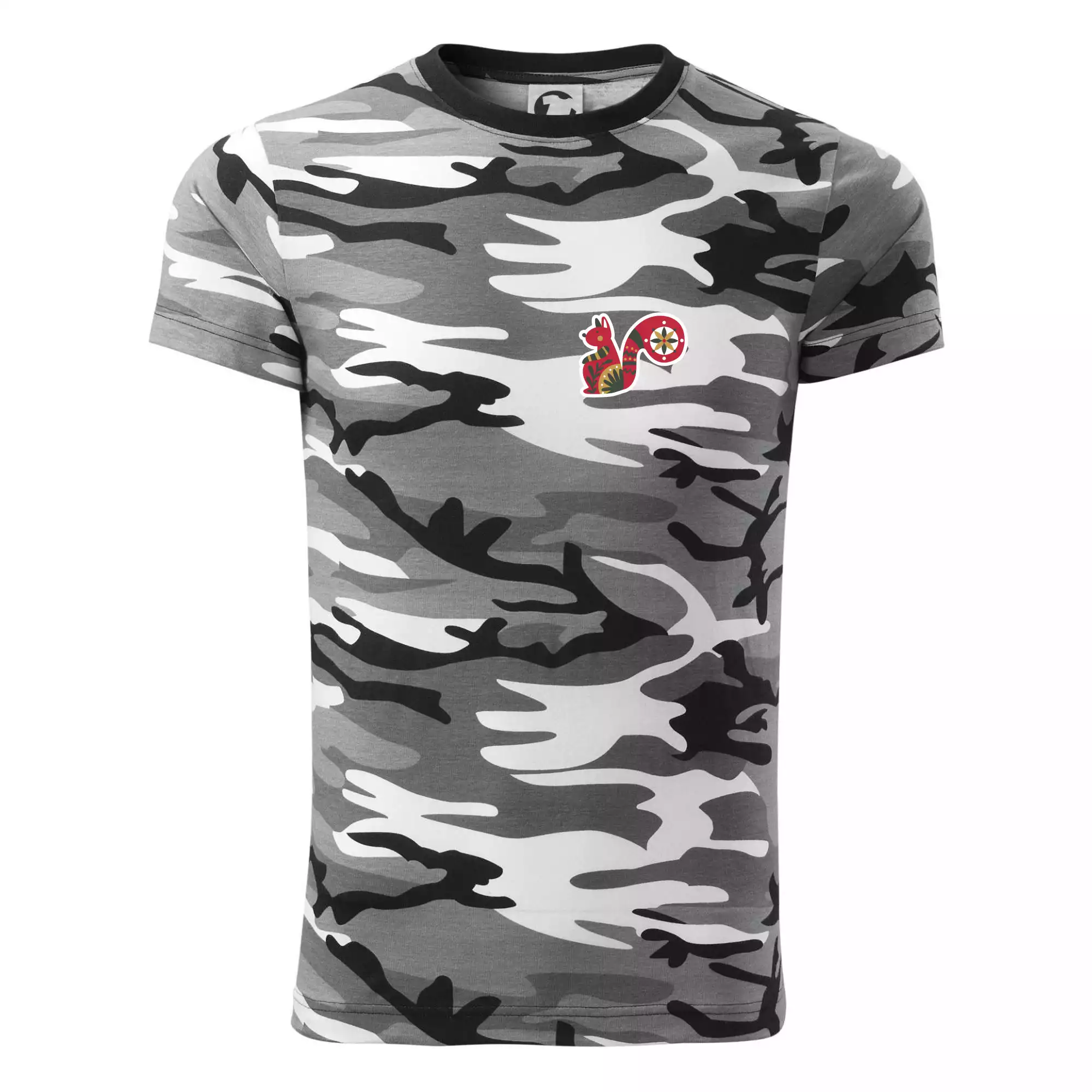 Tričko strednej gramáže vo farbách camouflage. Strih s bočnými švami. Lem priekrčníku z rebrového úpletu s prídavkom 5% elastanu. Vnútorná časť zadného priekrčníka začistená páskou vo farbe camouflage.