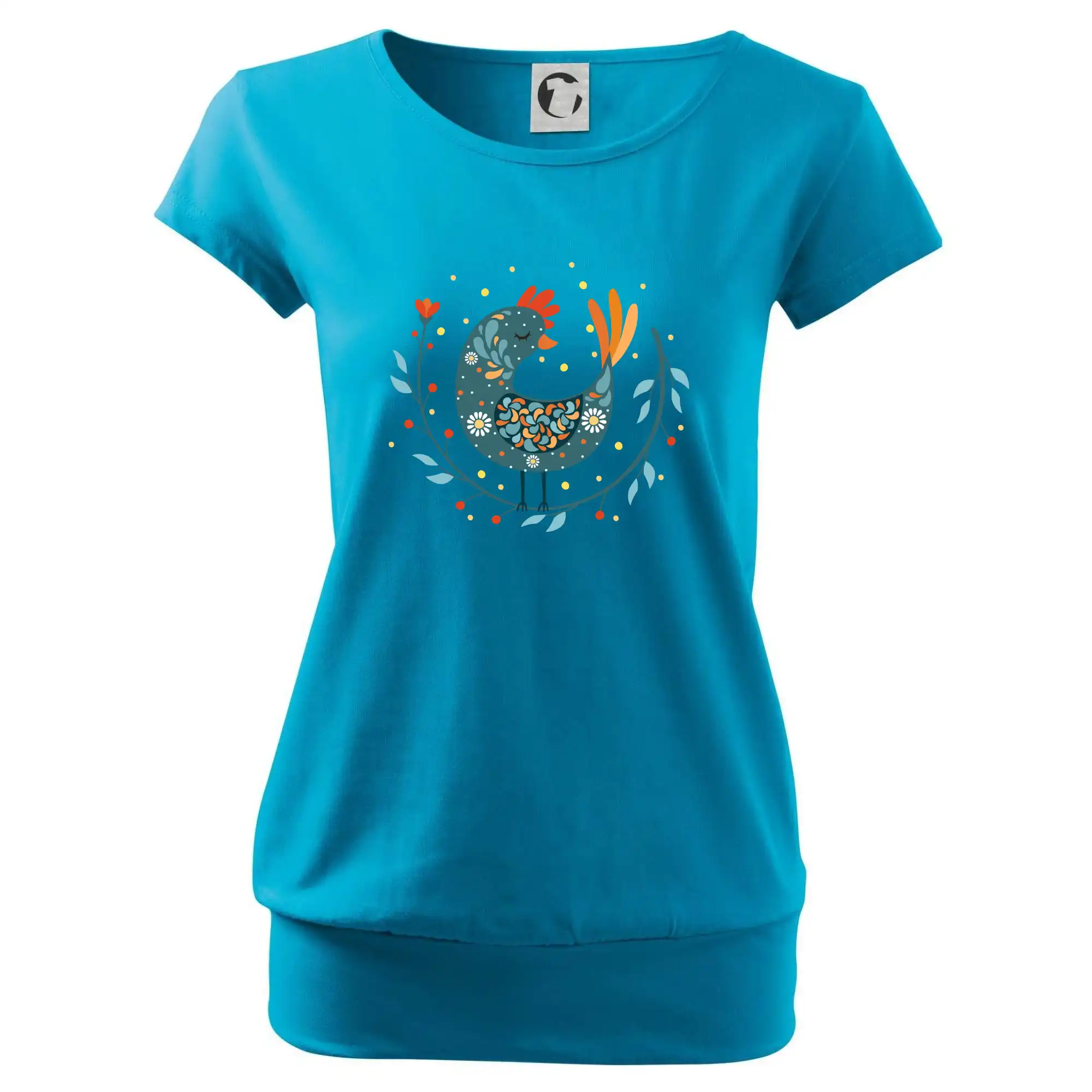 Trendové dámske tričko s veľmi krátkym rukávom, voľnejšieho strihu, v dolnom kraji všité do širokého lemu. Okrúhly priekrčník s úzkym lemom zo zhodného materiálu.