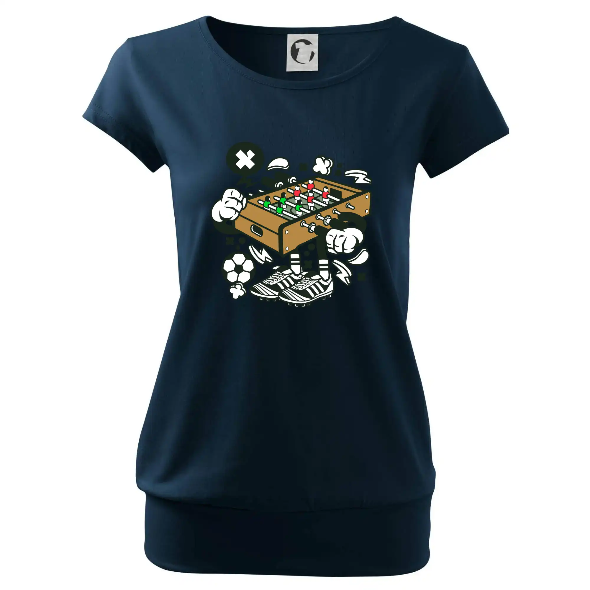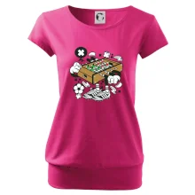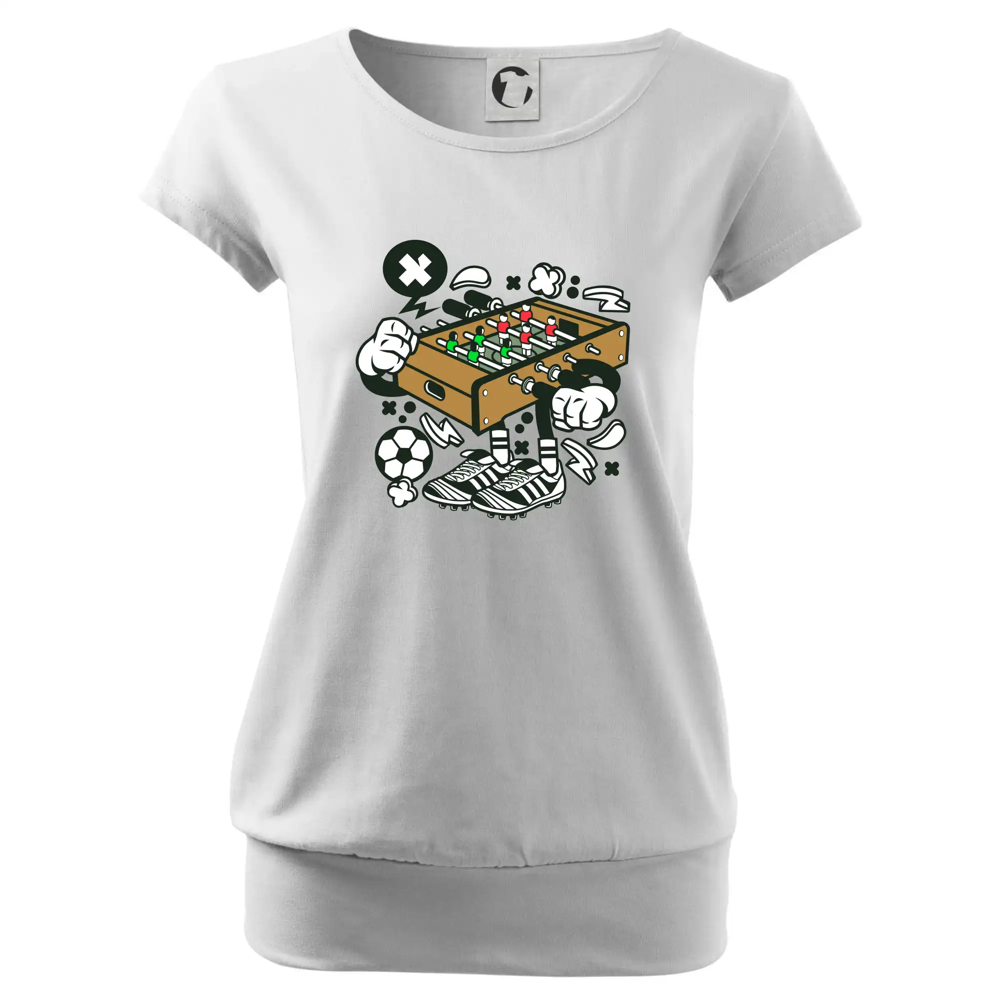 Trendové dámske tričko s veľmi krátkym rukávom, voľnejšieho strihu, v dolnom kraji všité do širokého lemu. Okrúhly priekrčník s úzkym lemom zo zhodného materiálu.