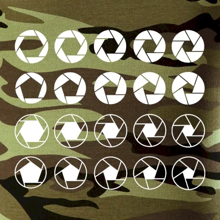Tričko strednej gramáže vo farbách camouflage. Strih s bočnými švami. Lem priekrčníku z rebrového úpletu s prídavkom 5% elastanu. Vnútorná časť zadného priekrčníka začistená páskou vo farbe camouflage.