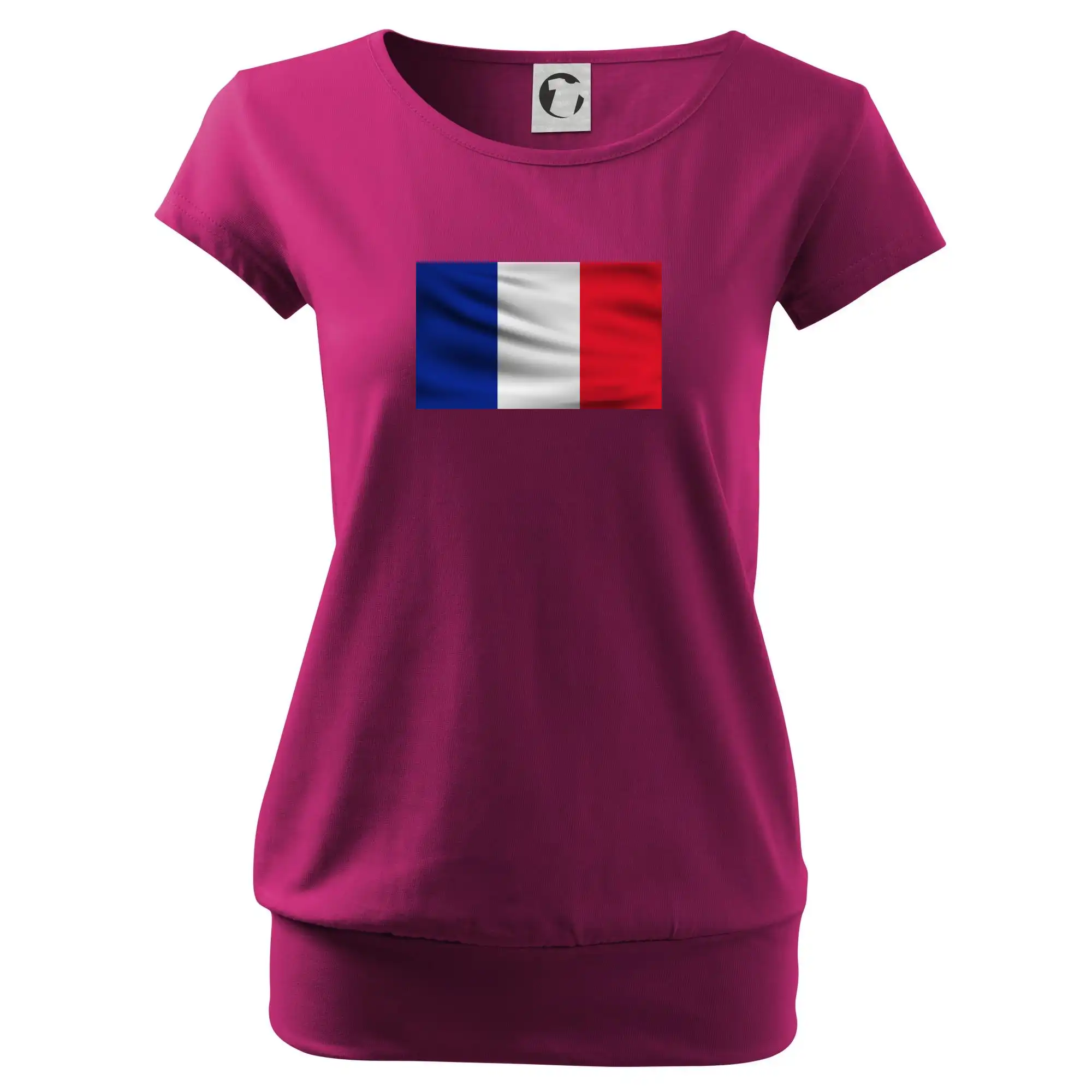 Trendové dámske tričko s veľmi krátkym rukávom, voľnejšieho strihu, v dolnom kraji všité do širokého lemu. Okrúhly priekrčník s úzkym lemom zo zhodného materiálu.