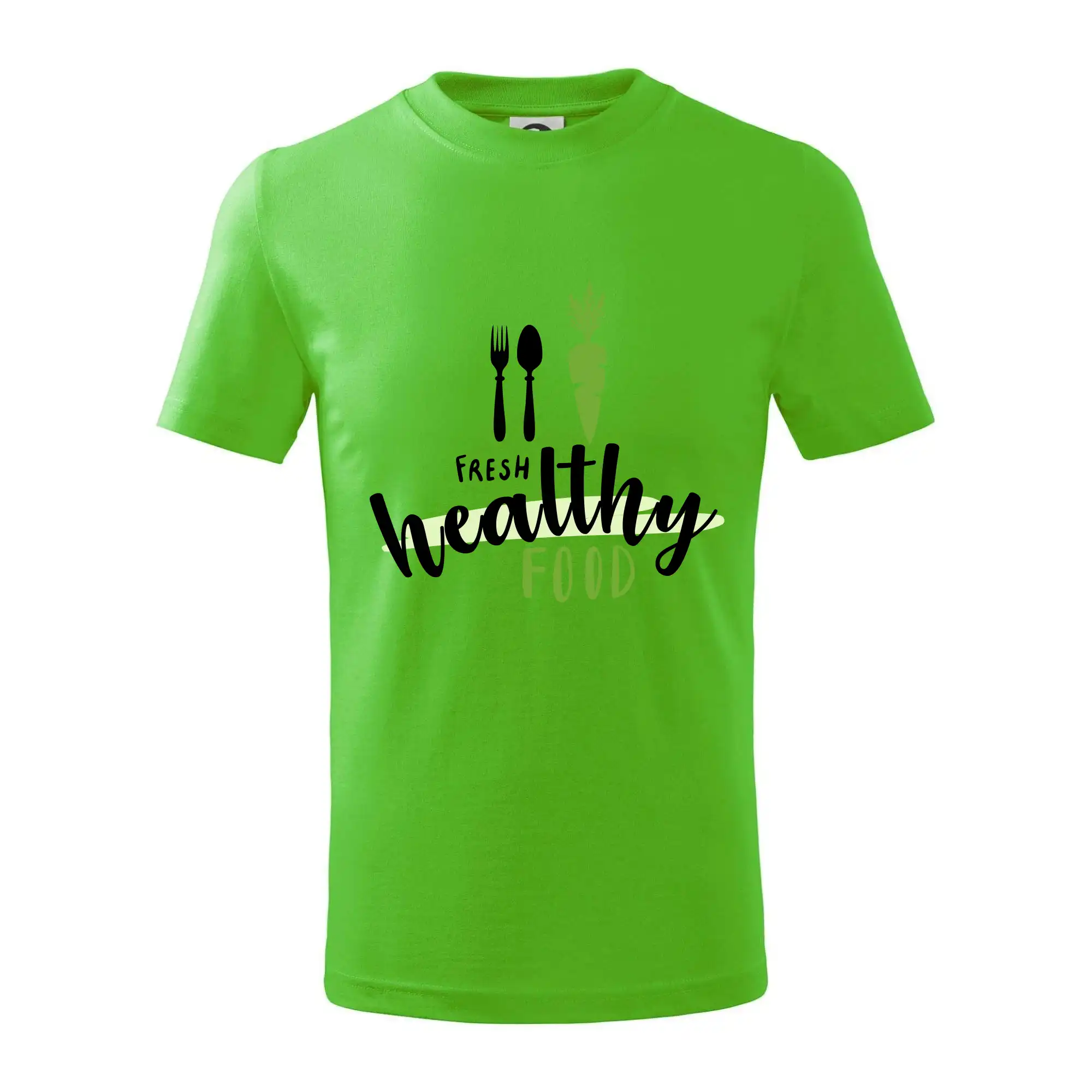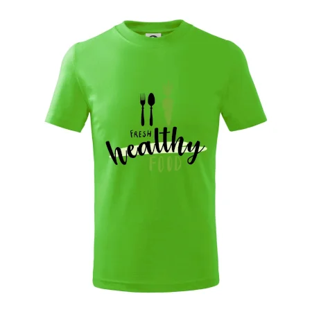 Detské tričko strednej gramáže s bočnými švami. Úzky priekrčník s prídavkom 5% elastanu. Vnútorná časť zadného priekrčníka začistená tkanou páskou. Spevnený ramenný šev.