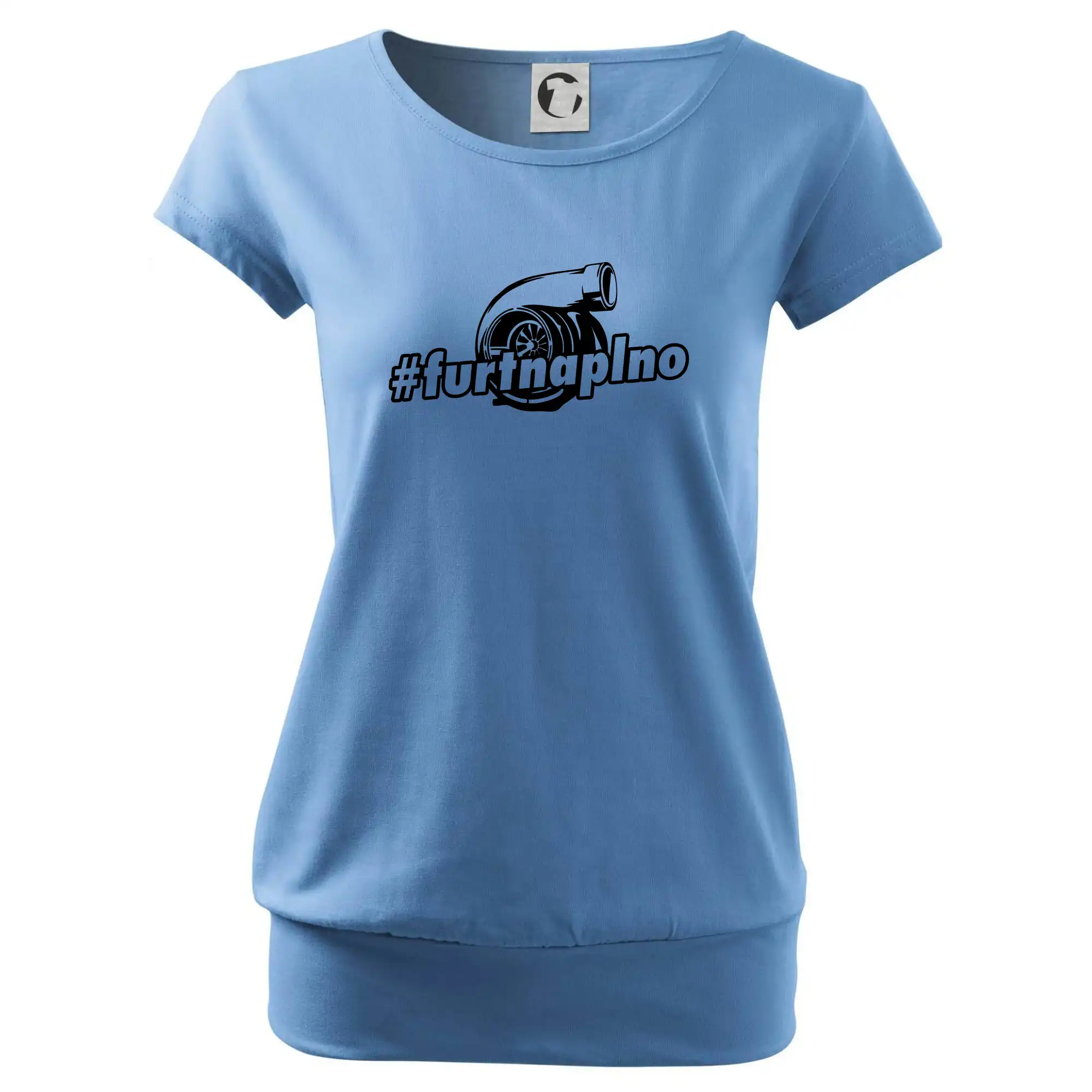 Trendové dámske tričko s veľmi krátkym rukávom, voľnejšieho strihu, v dolnom kraji všité do širokého lemu. Okrúhly priekrčník s úzkym lemom zo zhodného materiálu.