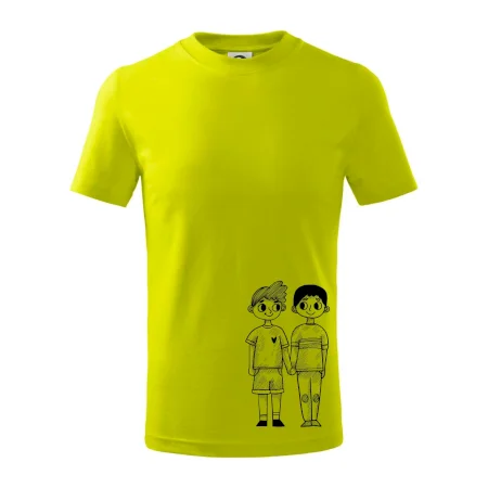 Detské tričko strednej gramáže s bočnými švami. Úzky priekrčník s prídavkom 5% elastanu. Vnútorná časť zadného priekrčníka začistená tkanou páskou. Spevnený ramenný šev.