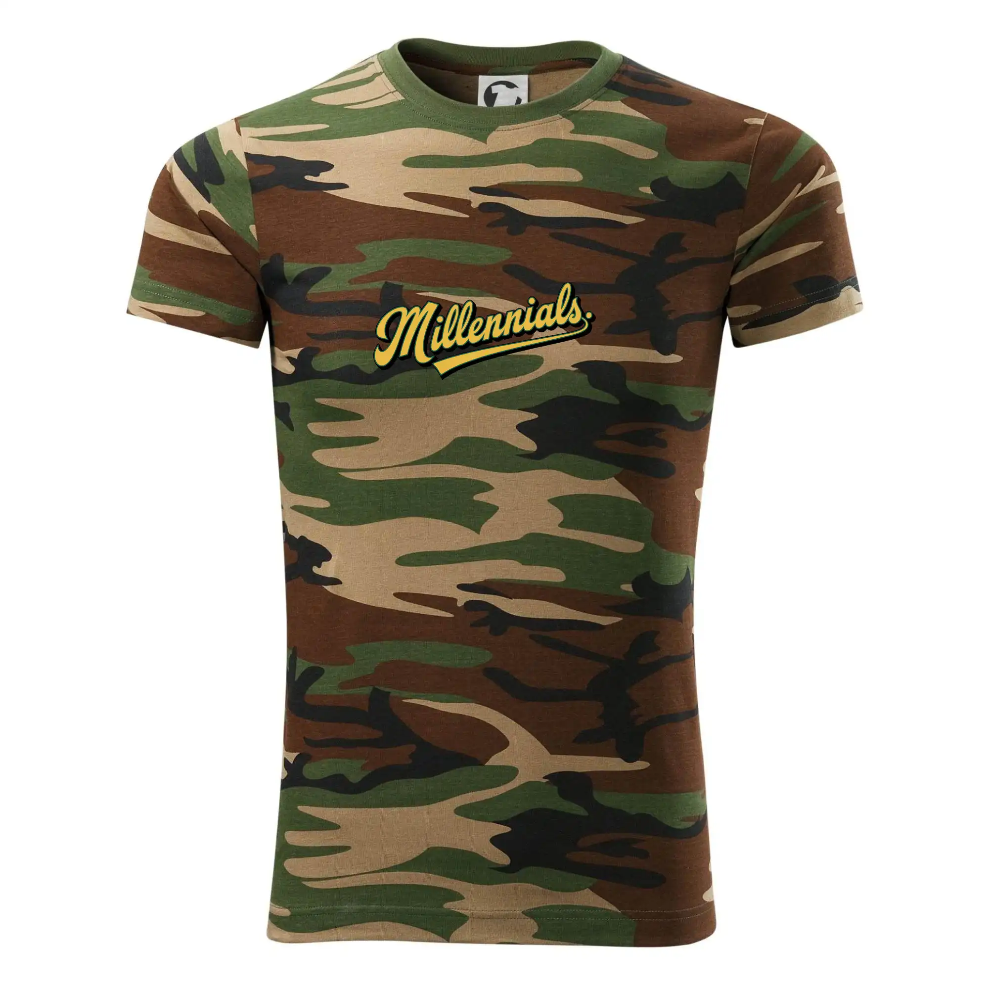 Tričko strednej gramáže vo farbách camouflage. Strih s bočnými švami. Lem priekrčníku z rebrového úpletu s prídavkom 5% elastanu. Vnútorná časť zadného priekrčníka začistená páskou vo farbe camouflage.
