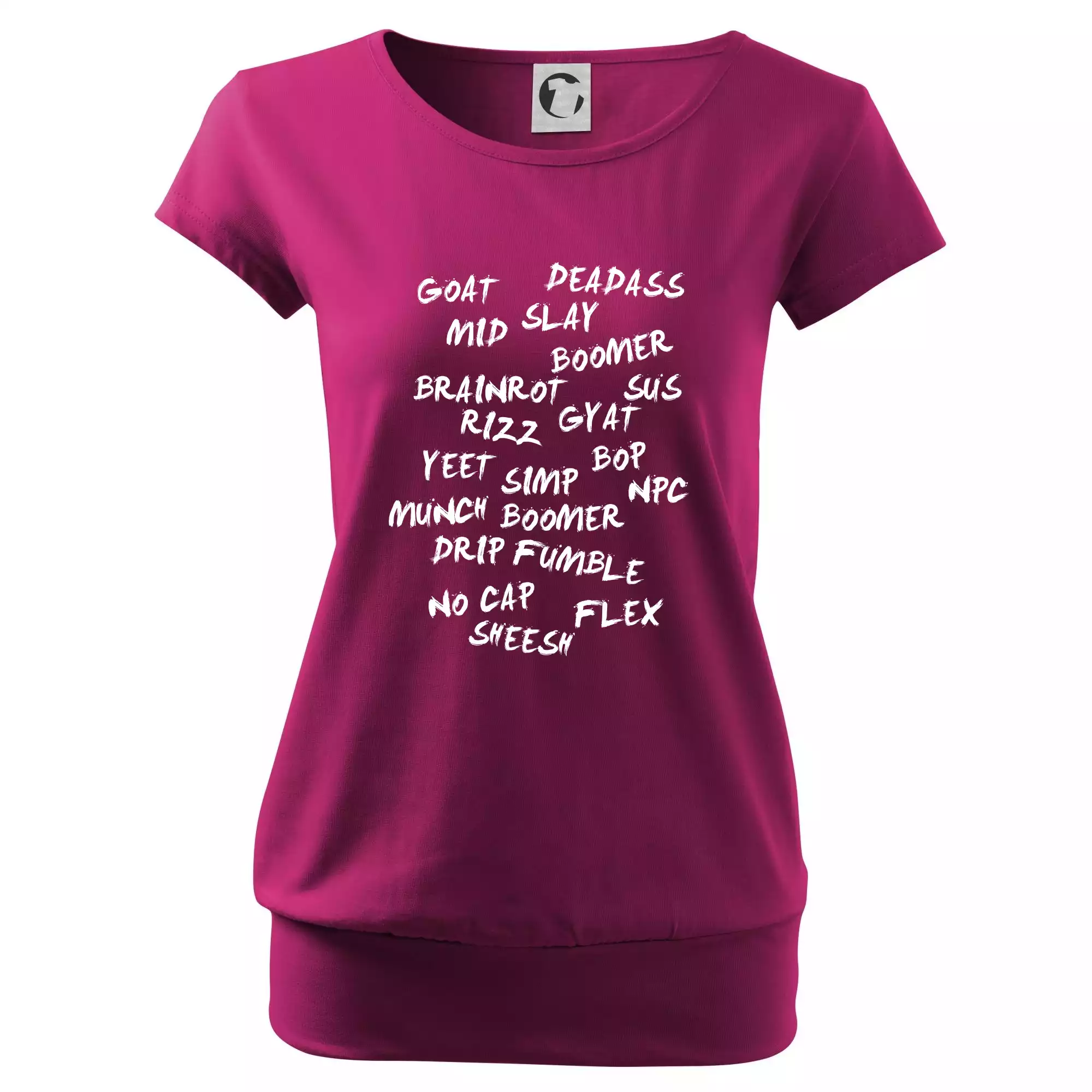 Trendové dámske tričko s veľmi krátkym rukávom, voľnejšieho strihu, v dolnom kraji všité do širokého lemu. Okrúhly priekrčník s úzkym lemom zo zhodného materiálu.