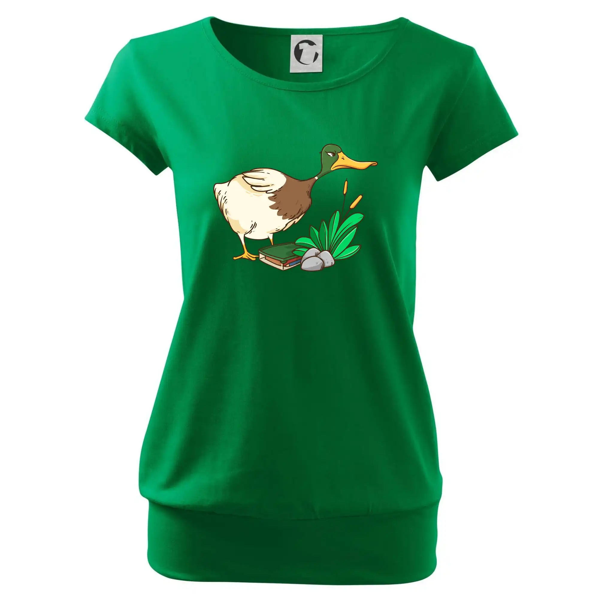 Trendové dámske tričko s veľmi krátkym rukávom, voľnejšieho strihu, v dolnom kraji všité do širokého lemu. Okrúhly priekrčník s úzkym lemom zo zhodného materiálu.