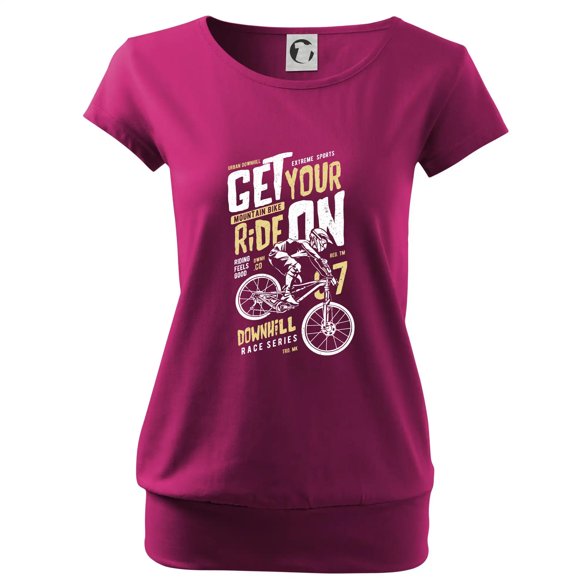 Trendové dámske tričko s veľmi krátkym rukávom, voľnejšieho strihu, v dolnom kraji všité do širokého lemu. Okrúhly priekrčník s úzkym lemom zo zhodného materiálu.