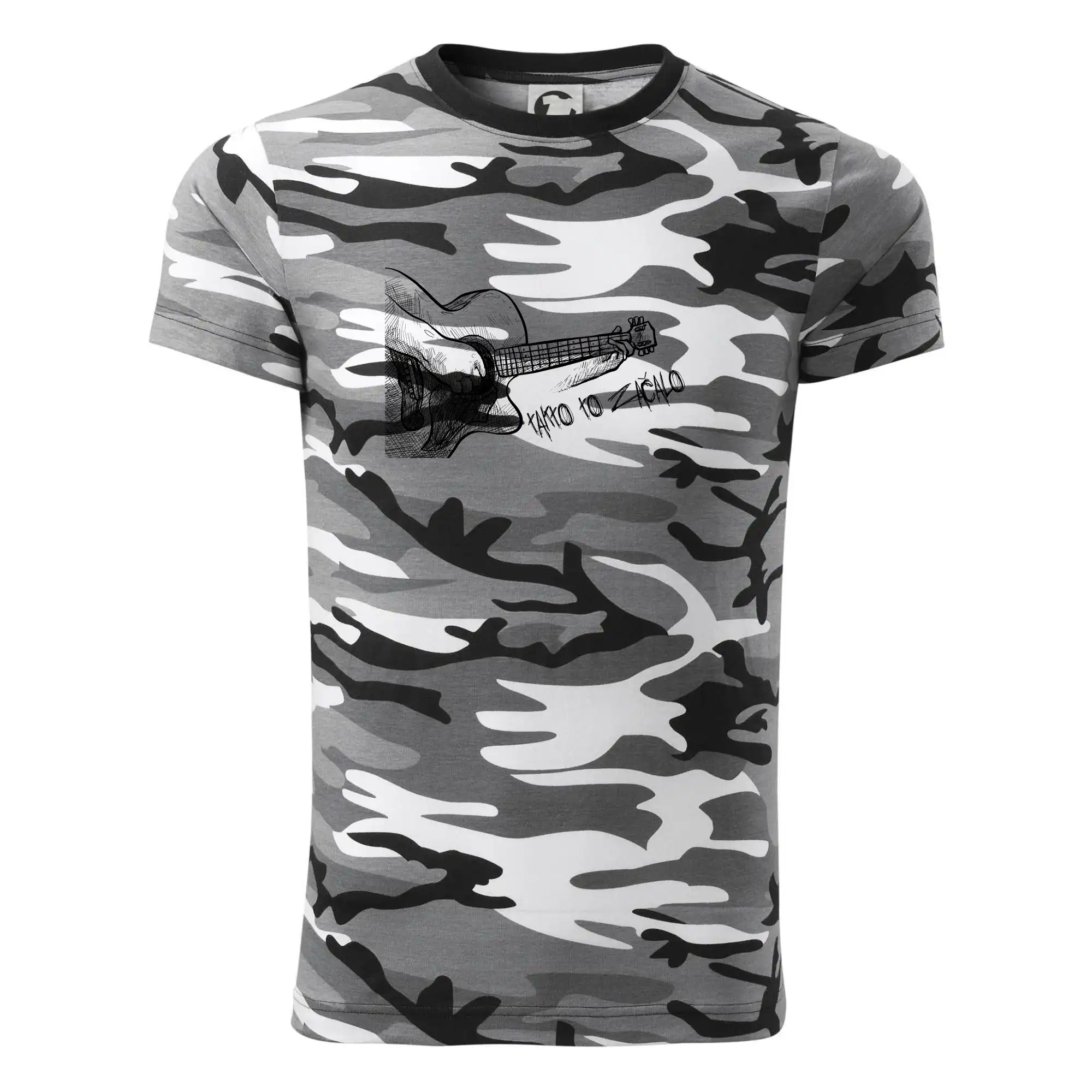 Tričko strednej gramáže vo farbách camouflage. Strih s bočnými švami. Lem priekrčníku z rebrového úpletu s prídavkom 5% elastanu. Vnútorná časť zadného priekrčníka začistená páskou vo farbe camouflage.