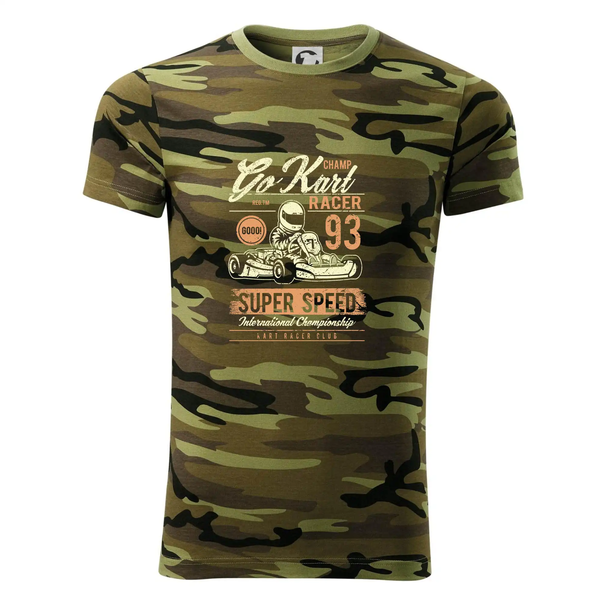 Tričko strednej gramáže vo farbách camouflage. Strih s bočnými švami. Lem priekrčníku z rebrového úpletu s prídavkom 5% elastanu. Vnútorná časť zadného priekrčníka začistená páskou vo farbe camouflage.