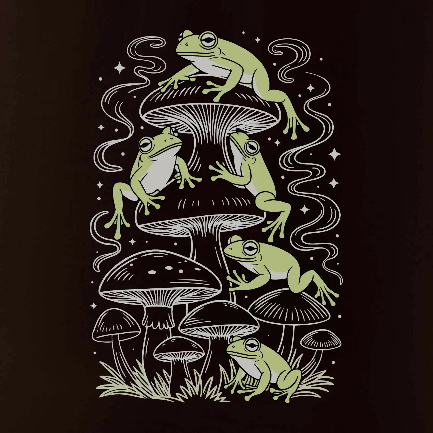 Goblincore frogs and various mushrooms