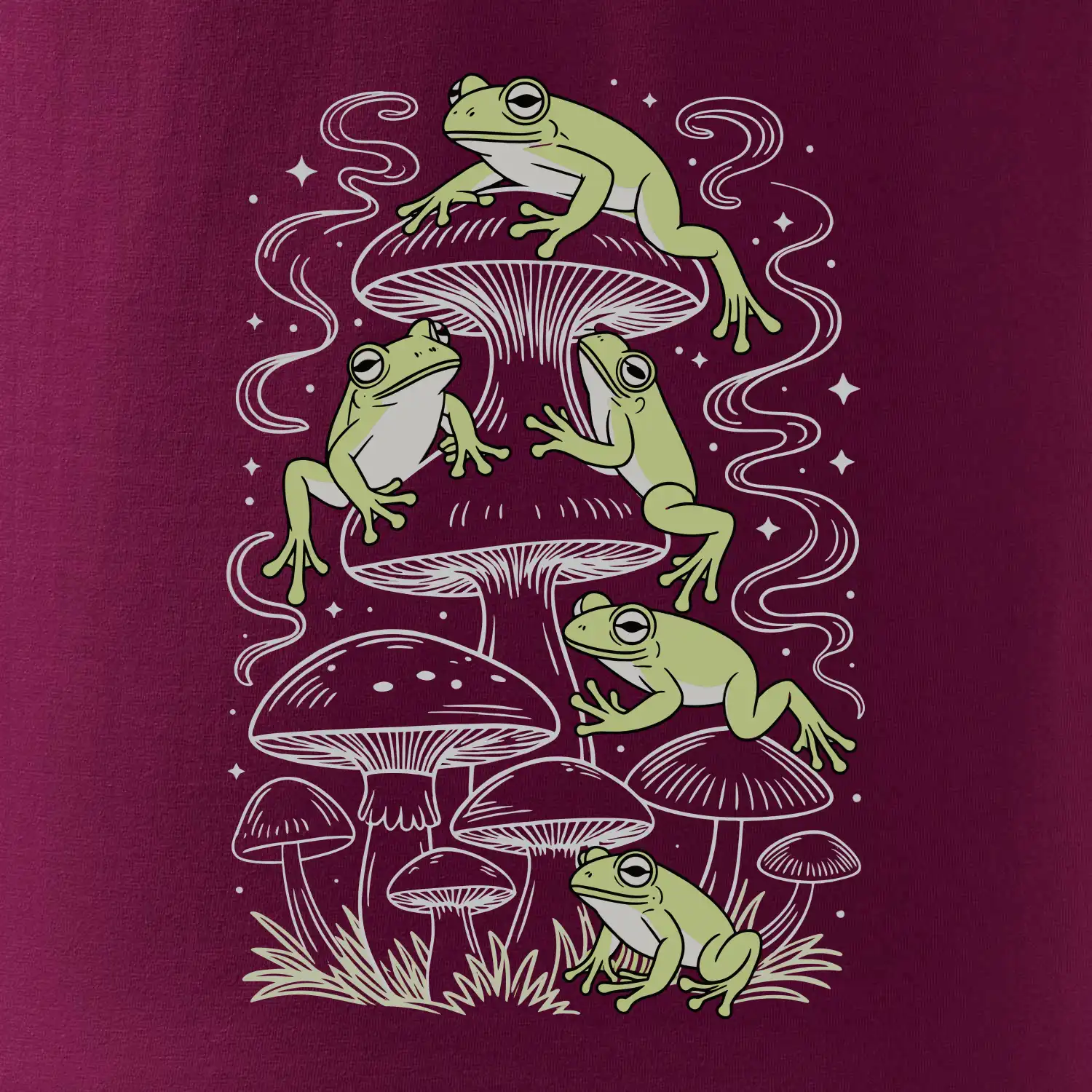 Goblincore frogs and various mushrooms