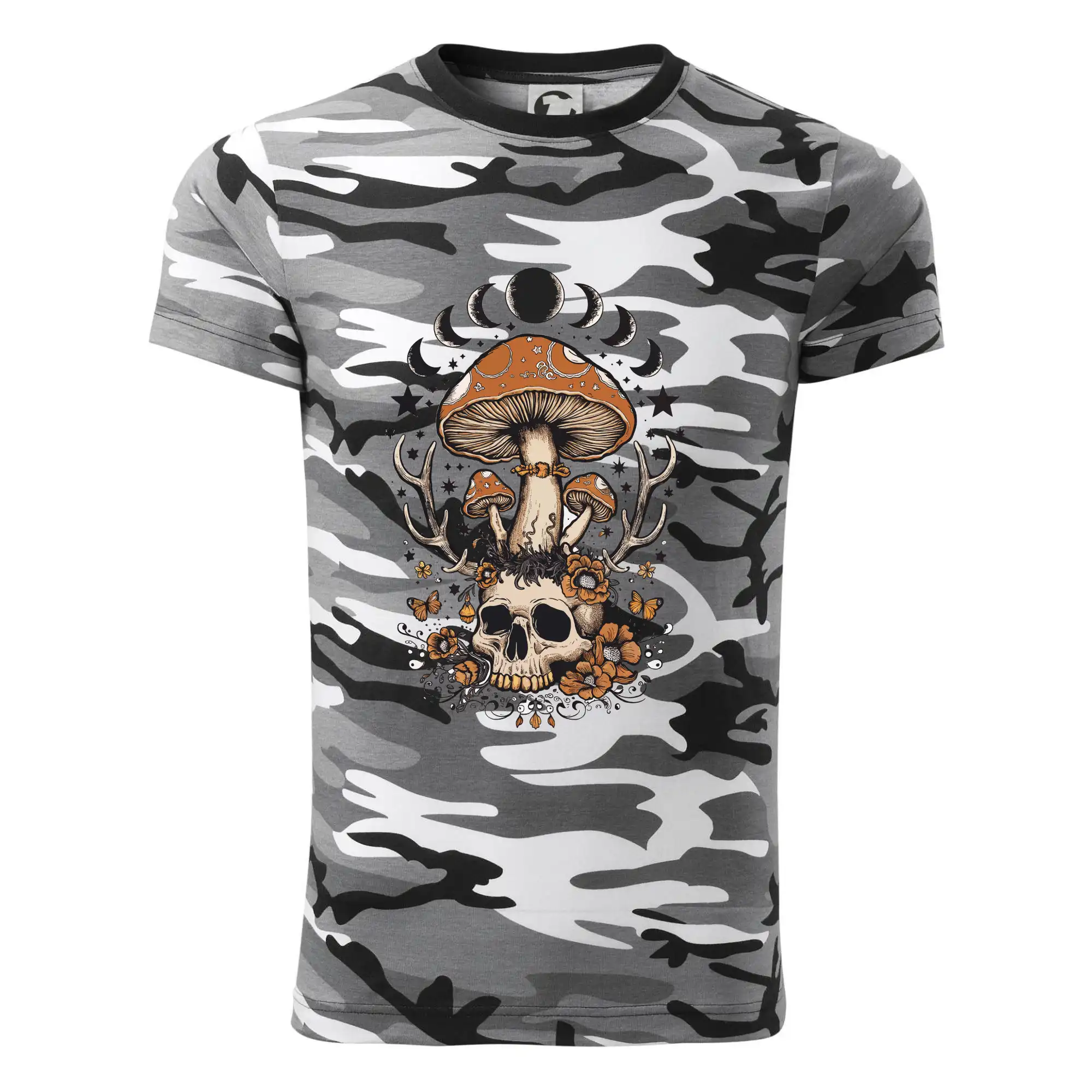 Tričko strednej gramáže vo farbách camouflage. Strih s bočnými švami. Lem priekrčníku z rebrového úpletu s prídavkom 5% elastanu. Vnútorná časť zadného priekrčníka začistená páskou vo farbe camouflage.