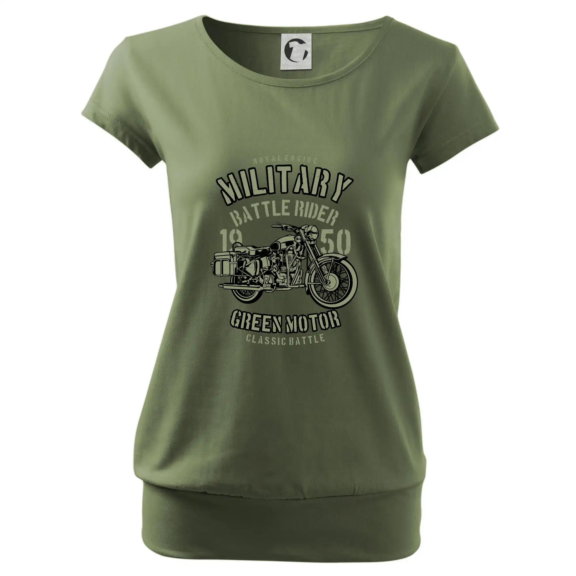 Trendové dámske tričko s veľmi krátkym rukávom, voľnejšieho strihu, v dolnom kraji všité do širokého lemu. Okrúhly priekrčník s úzkym lemom zo zhodného materiálu.