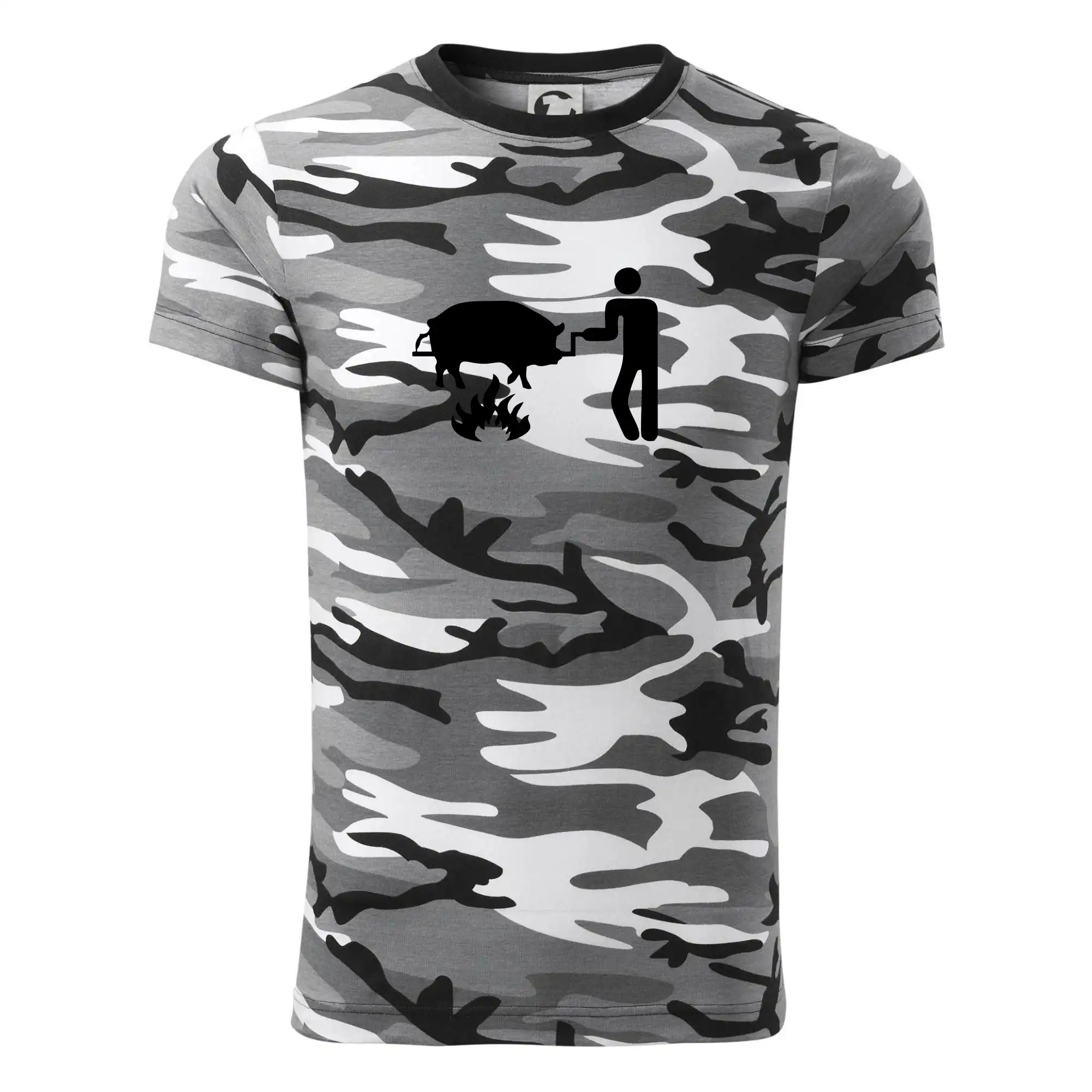 Tričko strednej gramáže vo farbách camouflage. Strih s bočnými švami. Lem priekrčníku z rebrového úpletu s prídavkom 5% elastanu. Vnútorná časť zadného priekrčníka začistená páskou vo farbe camouflage.