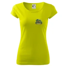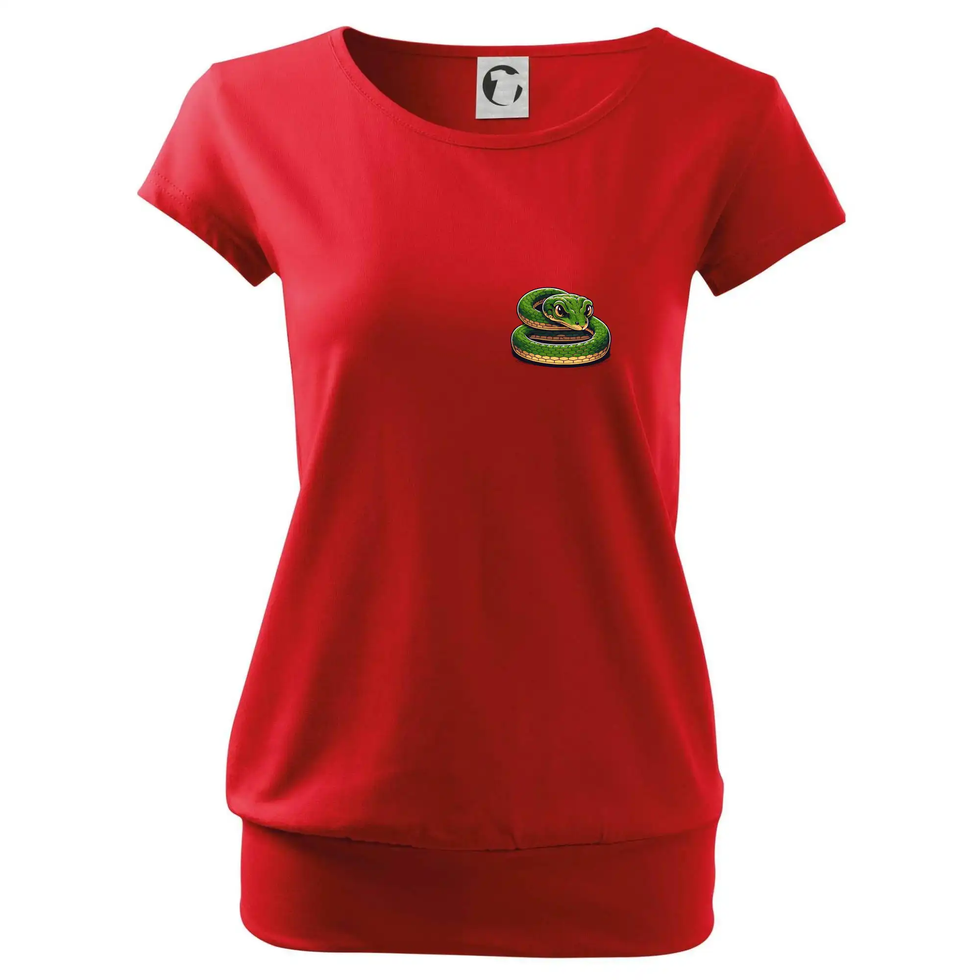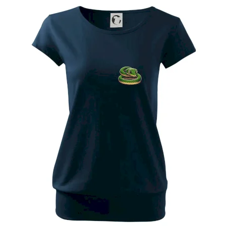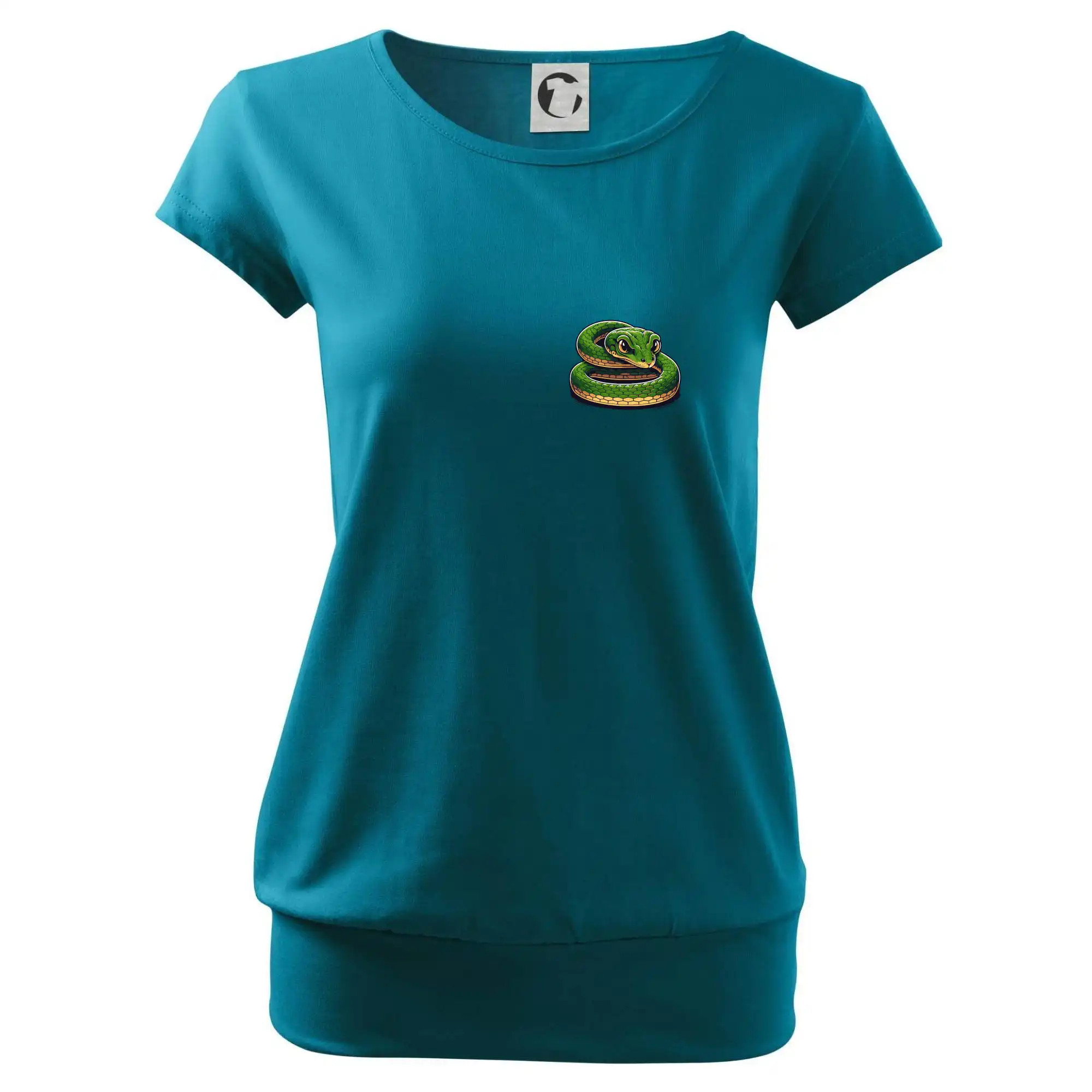 Trendové dámske tričko s veľmi krátkym rukávom, voľnejšieho strihu, v dolnom kraji všité do širokého lemu. Okrúhly priekrčník s úzkym lemom zo zhodného materiálu.