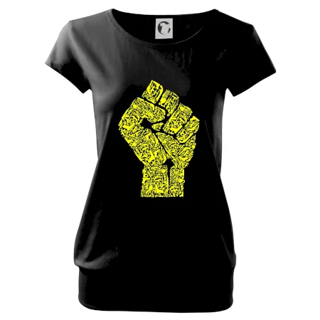 Trendové dámske tričko s veľmi krátkym rukávom, voľnejšieho strihu, v dolnom kraji všité do širokého lemu. Okrúhly priekrčník s úzkym lemom zo zhodného materiálu.