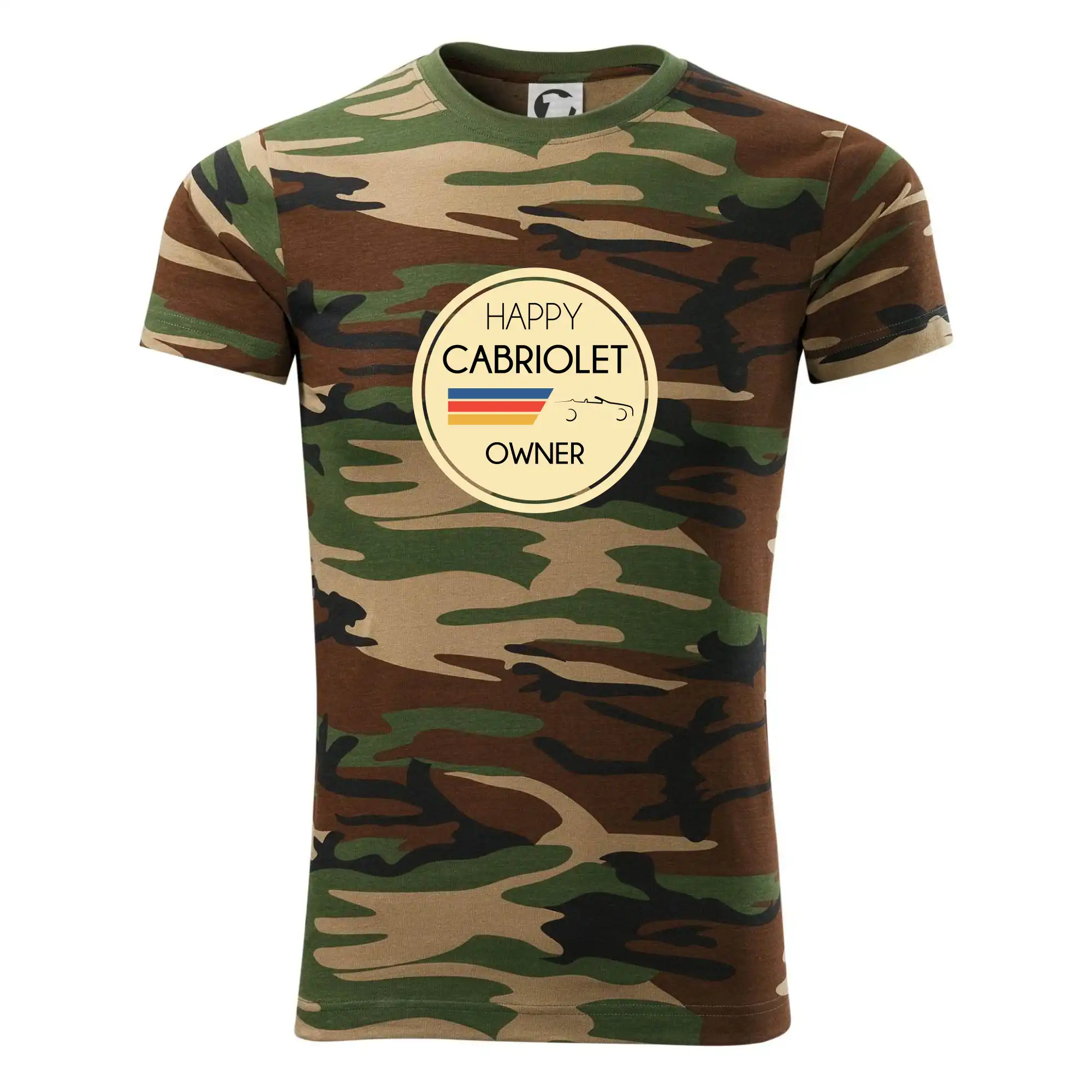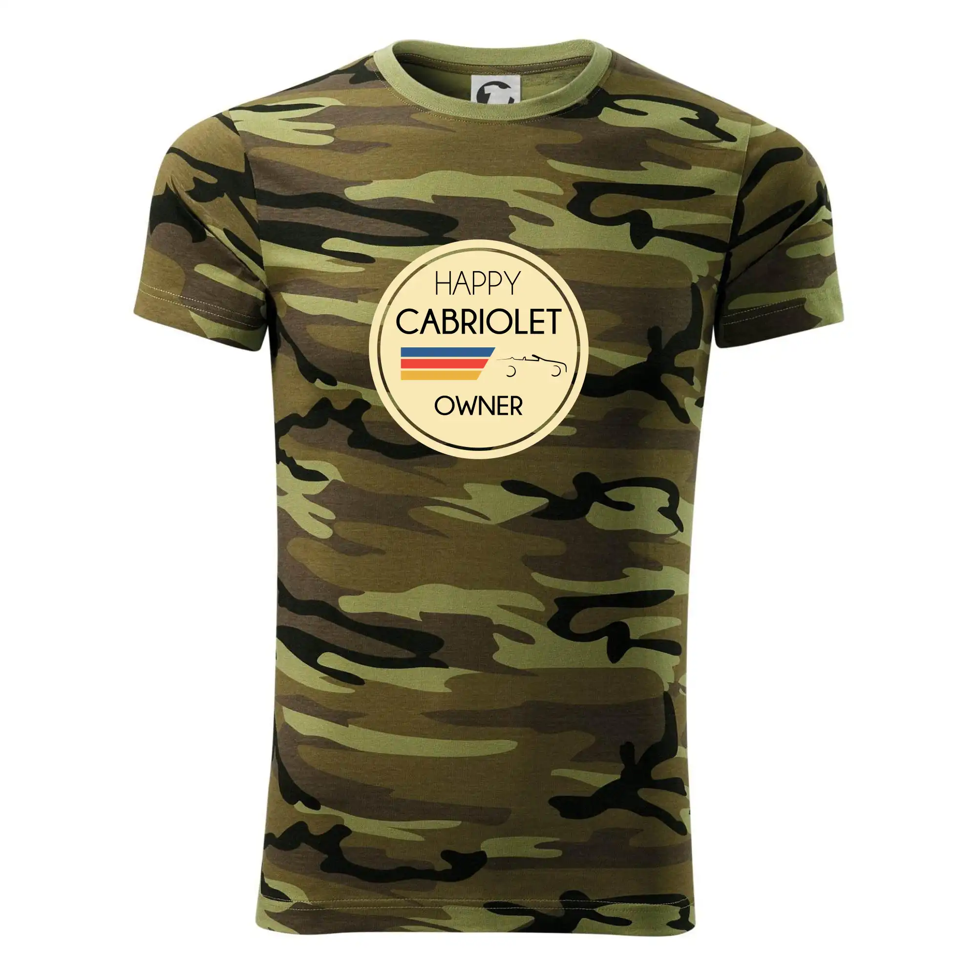 Tričko strednej gramáže vo farbách camouflage. Strih s bočnými švami. Lem priekrčníku z rebrového úpletu s prídavkom 5% elastanu. Vnútorná časť zadného priekrčníka začistená páskou vo farbe camouflage.