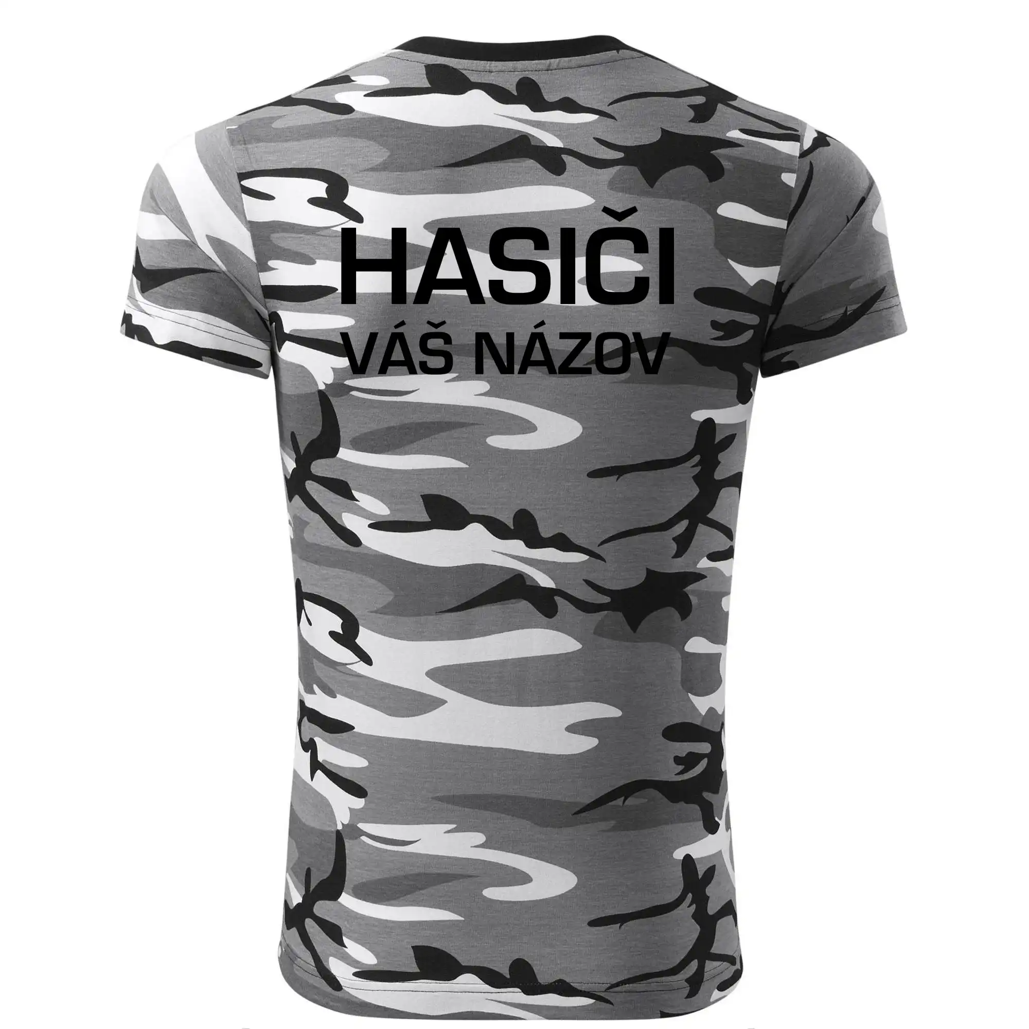 Tričko strednej gramáže vo farbách camouflage. Strih s bočnými švami. Lem priekrčníku z rebrového úpletu s prídavkom 5% elastanu. Vnútorná časť zadného priekrčníka začistená páskou vo farbe camouflage.