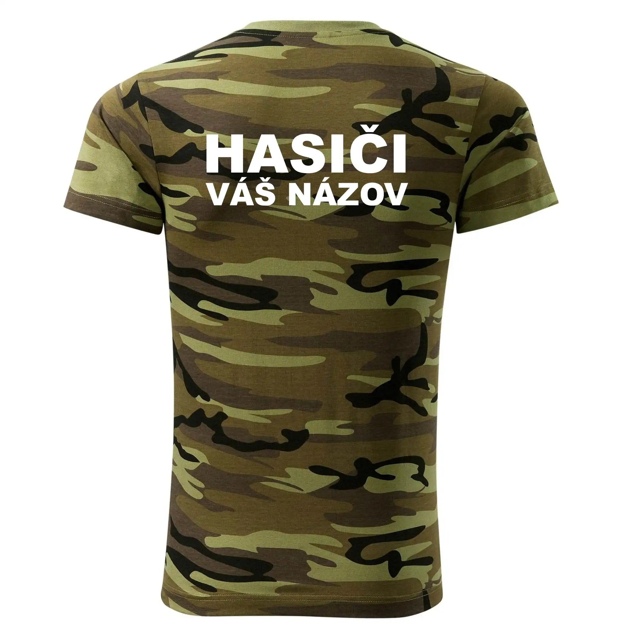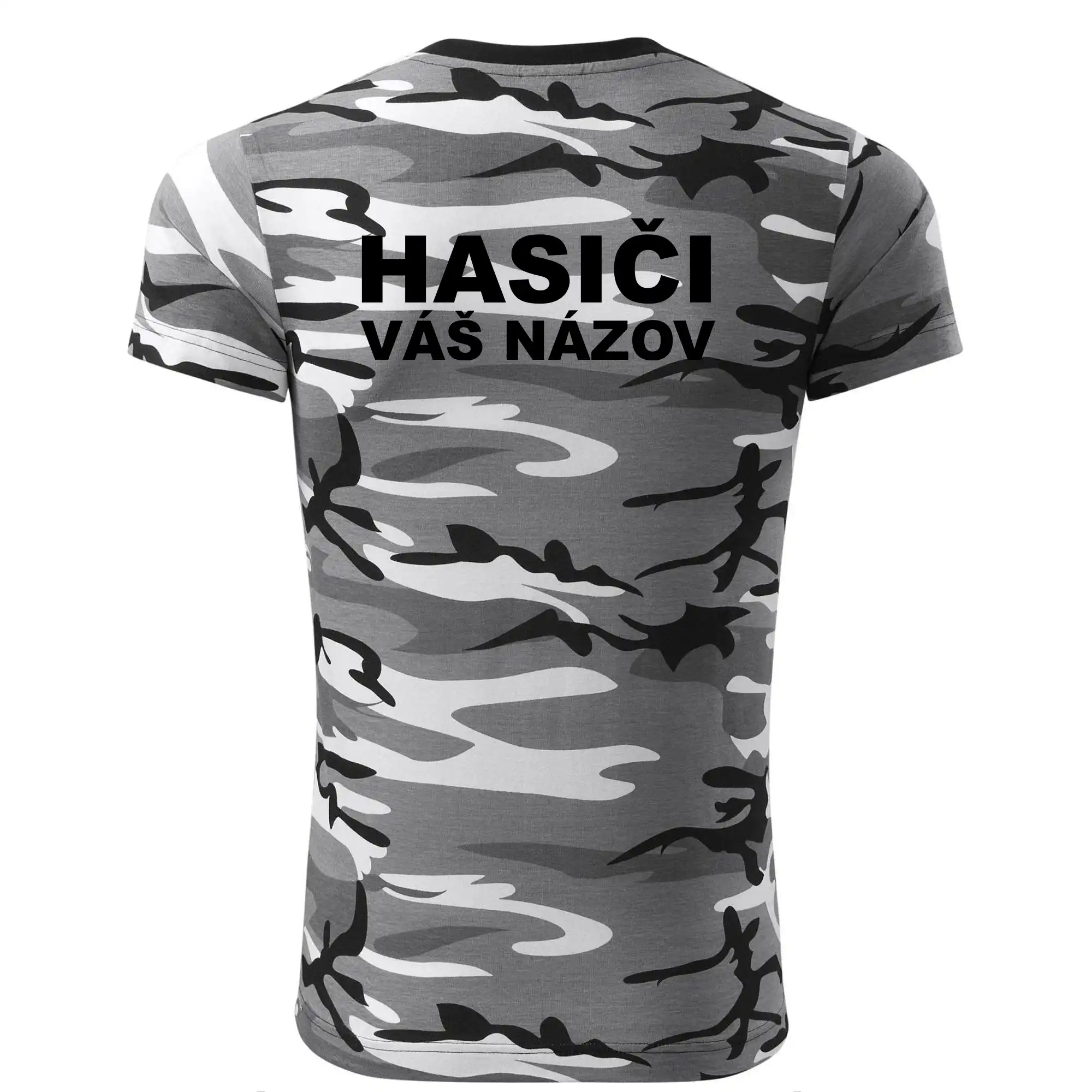 Tričko strednej gramáže vo farbách camouflage. Strih s bočnými švami. Lem priekrčníku z rebrového úpletu s prídavkom 5% elastanu. Vnútorná časť zadného priekrčníka začistená páskou vo farbe camouflage.