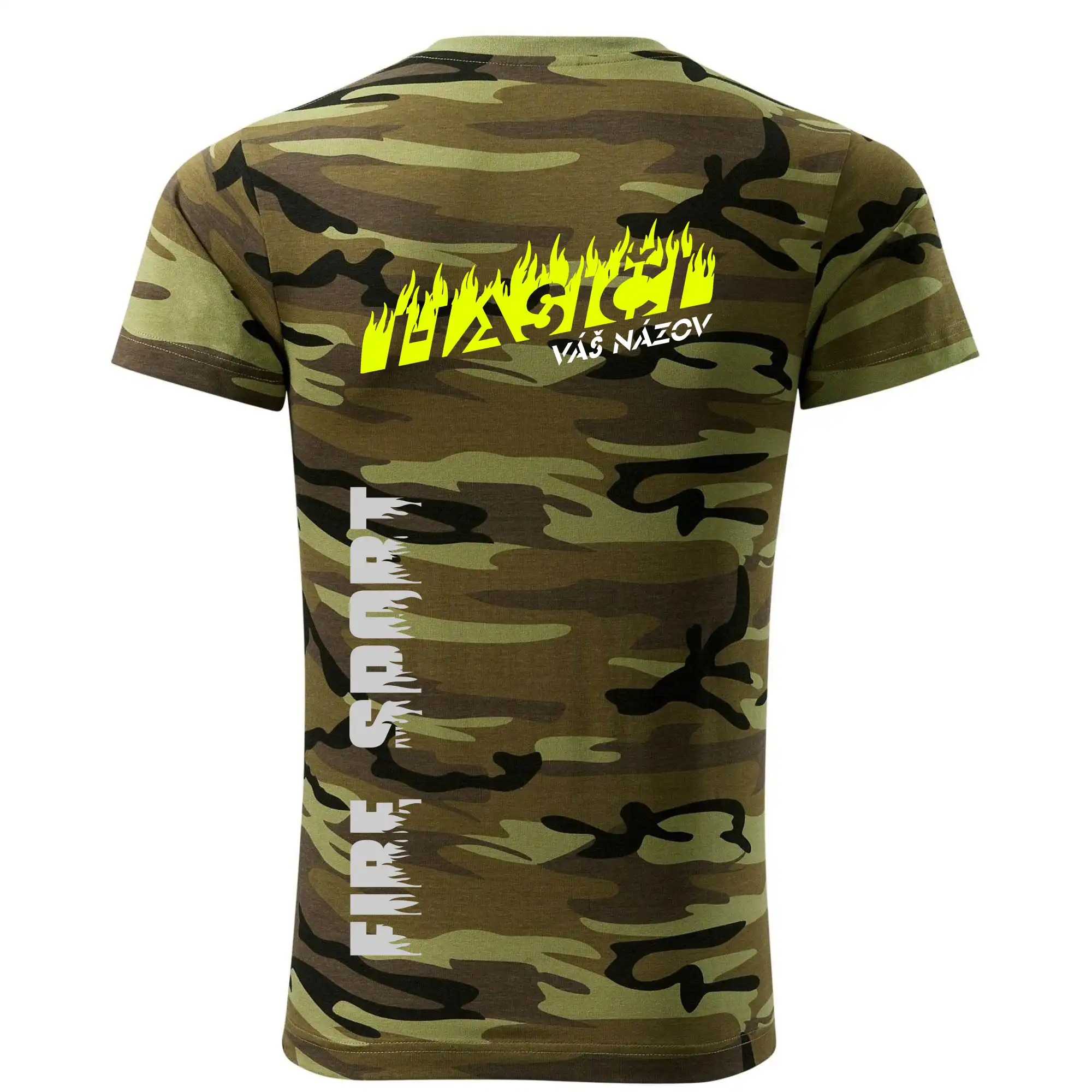 Tričko strednej gramáže vo farbách camouflage. Strih s bočnými švami. Lem priekrčníku z rebrového úpletu s prídavkom 5% elastanu. Vnútorná časť zadného priekrčníka začistená páskou vo farbe camouflage.