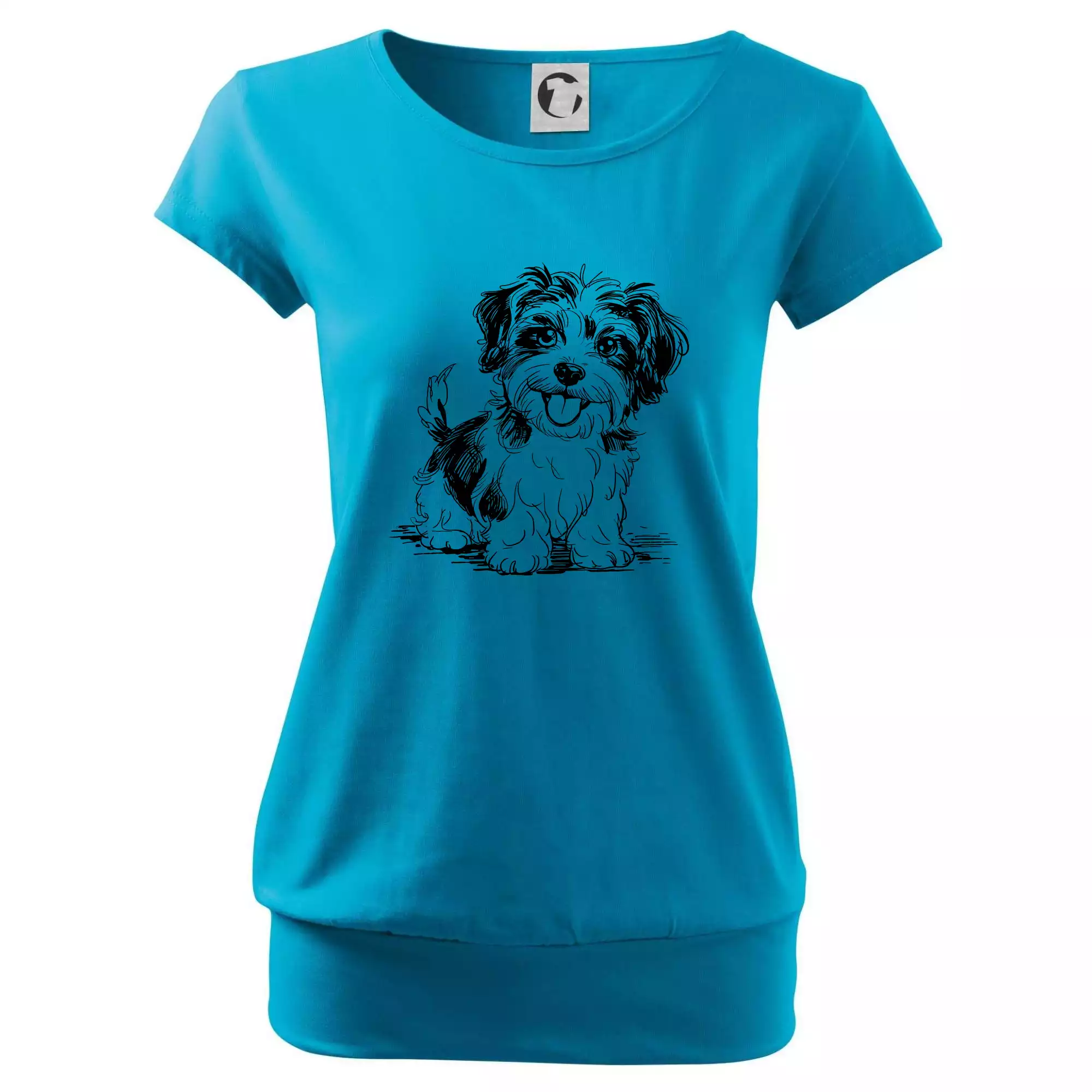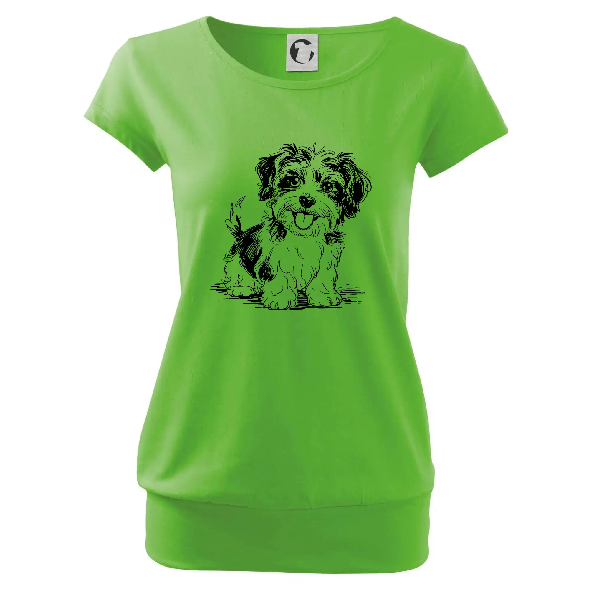 Trendové dámske tričko s veľmi krátkym rukávom, voľnejšieho strihu, v dolnom kraji všité do širokého lemu. Okrúhly priekrčník s úzkym lemom zo zhodného materiálu.